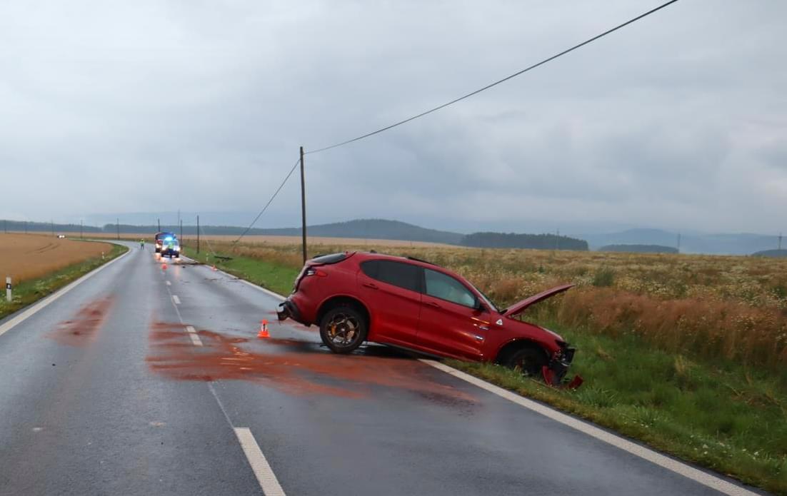 "Padesátiletý řidič osobního automobilu Alfa Romeo Stelvio jedoucí ve směru od obce Březí na obec Horšovský Týn nepřizpůsobil rychlost jízdy, při projíždění pravotočivé zatáčky dostal na mokrém povrchu komunikace s vozidlem smyk a vyjel vlevo mimo komunikaci, kde narazil do sloupu telefonního vedení," popsala tisková mluvčí policie s tím, že po havárii bylo vozidlo částečně odraženo zpět na komunikaci.