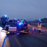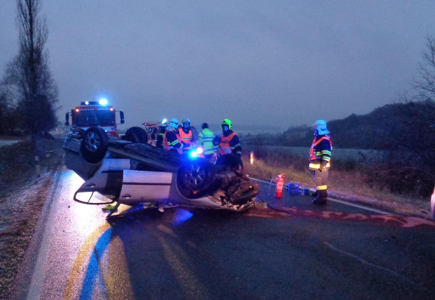 Před sedmou ráno zasahovali hasiči u dopravní nehody se zraněním za Zbirohem ve směru na obec Kařez. Mladá řidička ve vozidle Škoda Octavia jela ve směru od Zbiroha na Kařez a po projetí pravotočivé zatáčky nezvládla řízení. Auto se dostalo do smyku, sjelo mimo komunikaci do silničního příkopu, kde se po nárazu do travnatého břehu odhodilo zpět na komunikaci a po přetočení na střechu zůstalo uprostřed komunikace. Řidička utrpěla zranění, pro která byl nutný transport do nemocnice. Vzhledem k charakteru nehody bylo místo obousměrně uzavřeno pro potřeby složek IZS. Jednotka hasičů provedla řádné označení této vzniklé situace v obou směrech v přehledných úsecích ve vzdálenosti 150 až 200 metrů světelnými výstražnými kužely. Směrem od obce Zbiroh byl umístěn uniformovaný hasič ve výstražné vestě s nápisem "Hasiči."