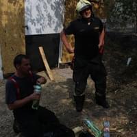„Došla voda! …..“ ozve se ve vysílačce (je doplněno jadrným klením, které nemůžeme publikovat.) „My ji přivezli!“ ozve se odpověď a my zjišťujeme, že mezi „našimi“ hasiči, se kterými jsme zde od samotného počátku, se objevuje vítaná posila. Poznáme je jednoduše, mají o stupeň světlejší hasičské kabáty a o dva stupně světlejší obličeje.