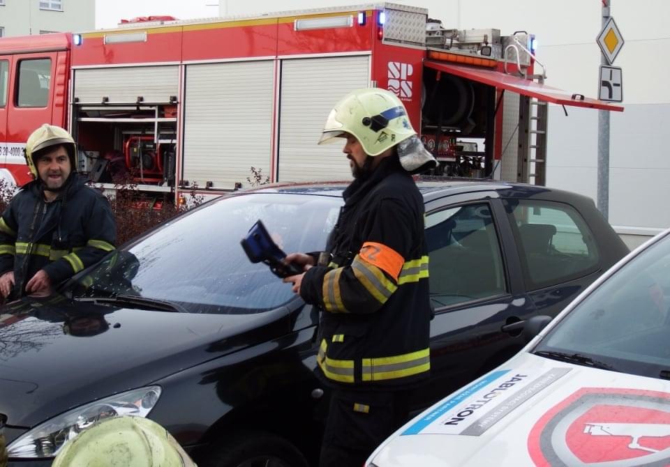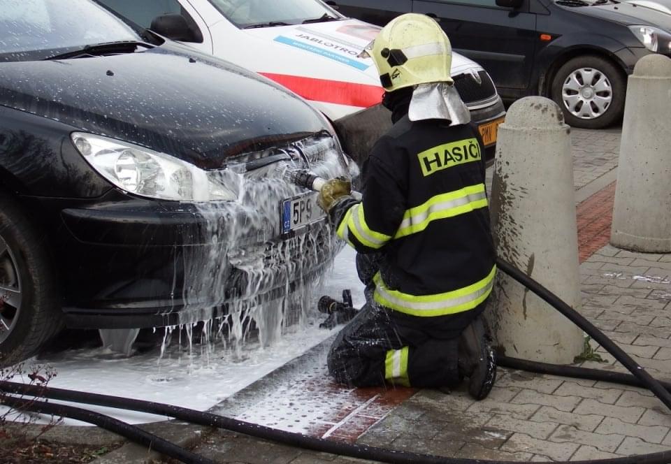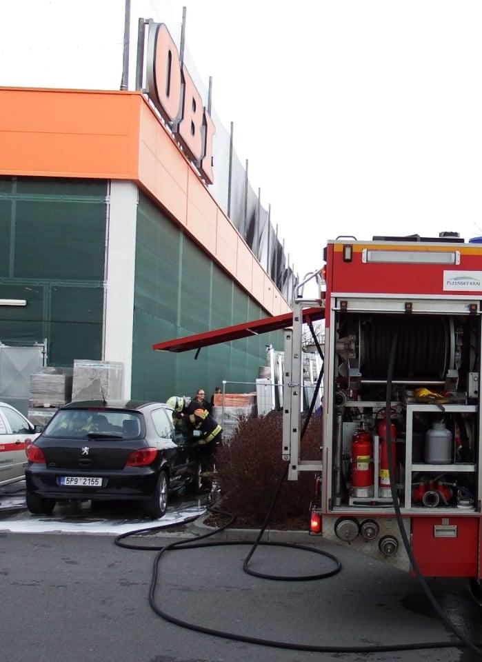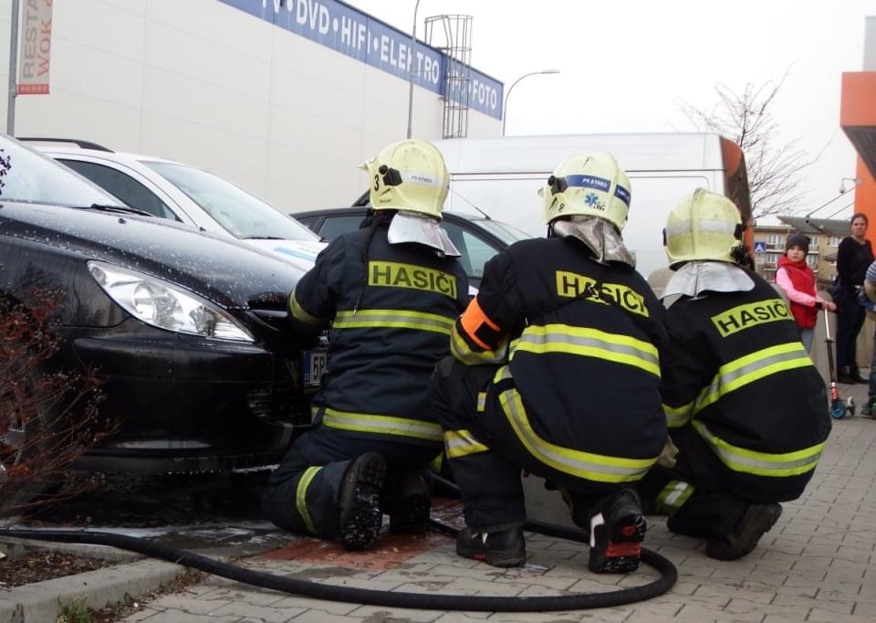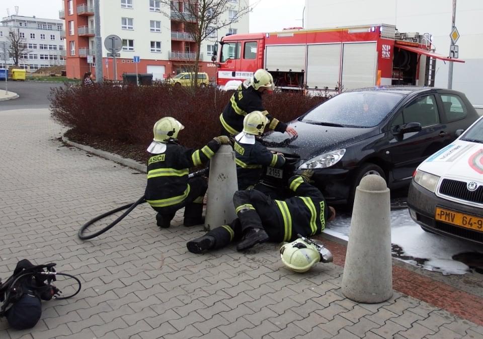 Na parkovišti se začal valit dým zpod kapoty automobilu Peugeot. Hasiči prolili motor pěnou a nyní čekají na místě, kontrolují za pomoci teromkamery, jestli neobjeví další ohnisko požáru.
