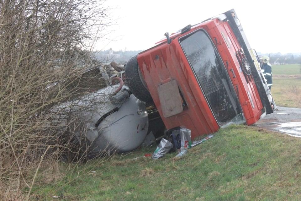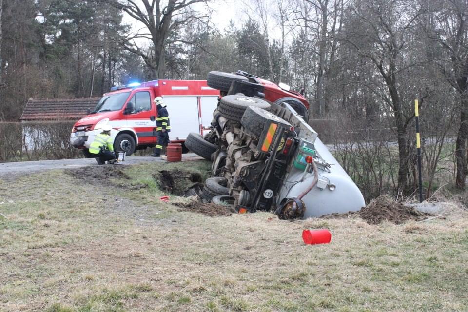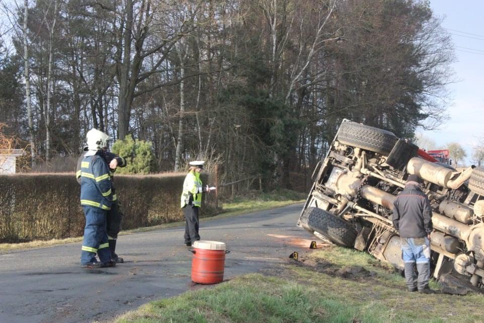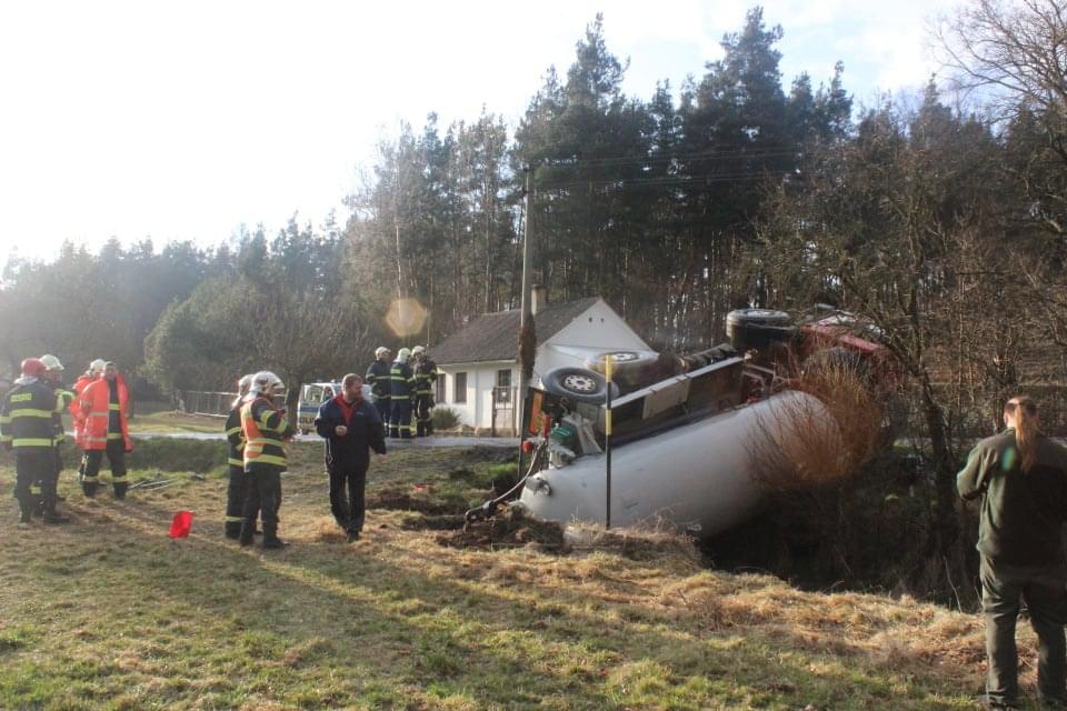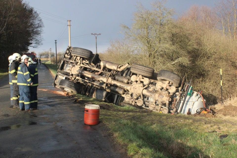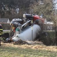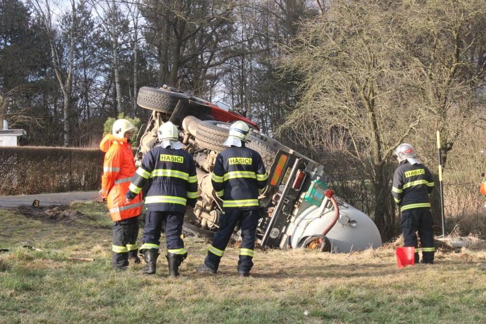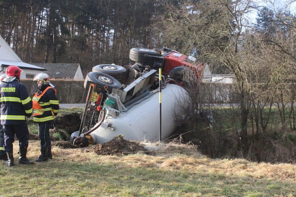Řidič cisterny chtěldnes odpolednezajet na pole a zahájit hnojení, když zřejmě špatně odhadl zatáčku, najel si blízko ke kraji a utrhla se pod ním krajnice. Celá cisterna se tak převrátila na střechu, těžkou zadní částí sklouzla do potoka a bohužel část nákladu začal unikat do vody. Řidič naštěstí skončil nezraněn a z vozu se dostal střešním okénkem.