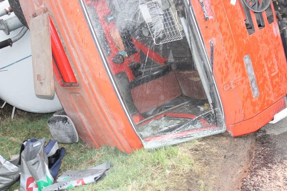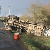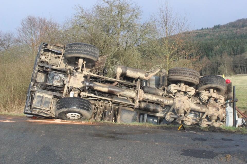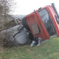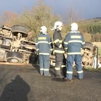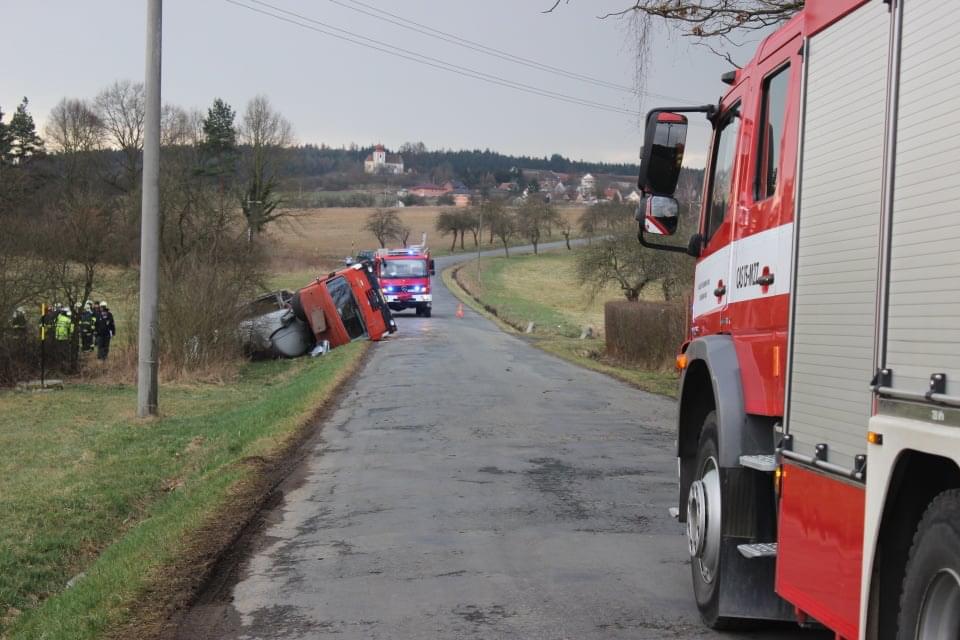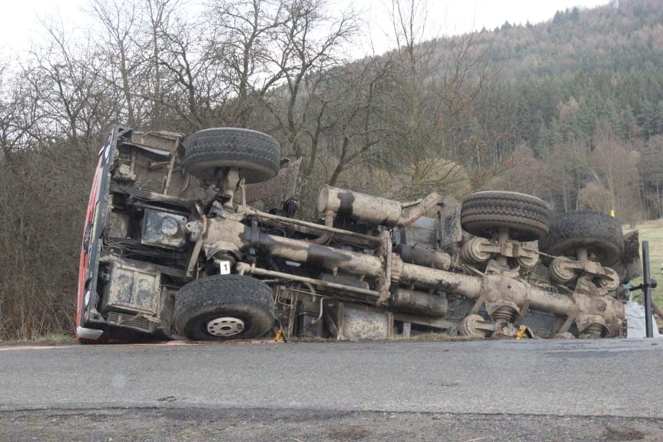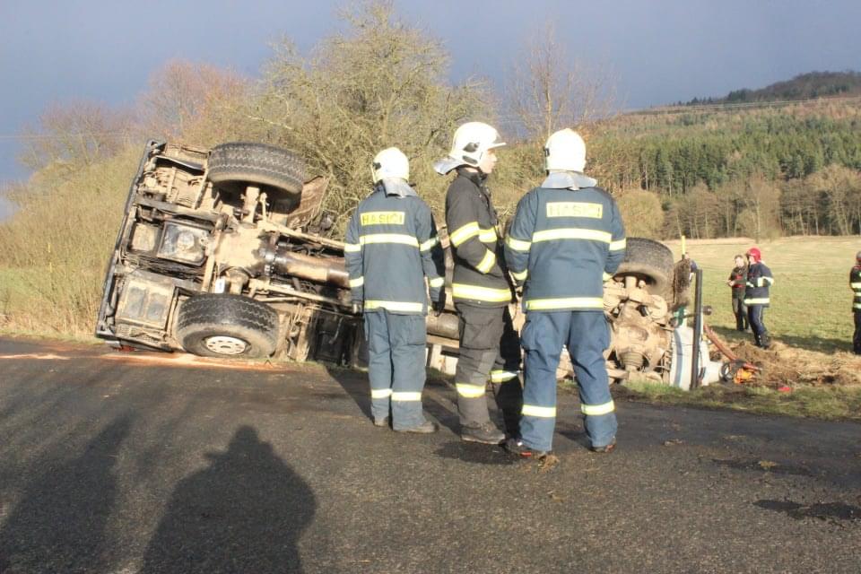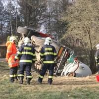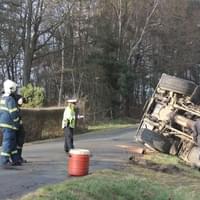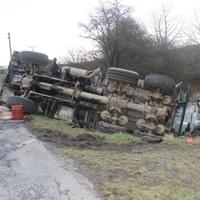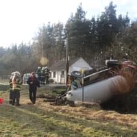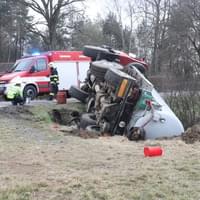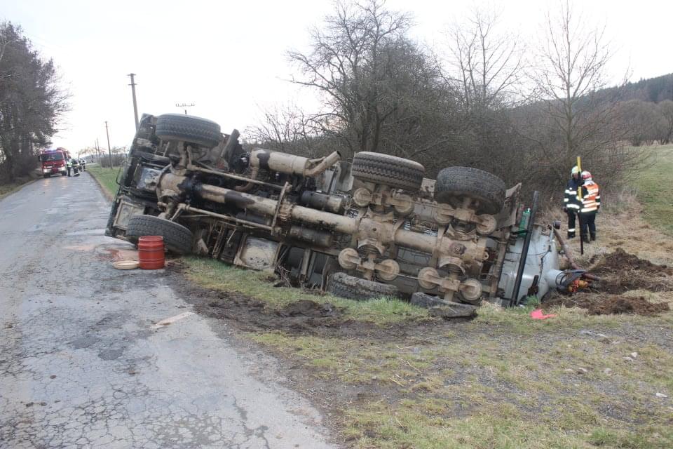 Řidič cisterny chtěldnes odpolednezajet na pole a zahájit hnojení, když zřejmě špatně odhadl zatáčku, najel si blízko ke kraji a utrhla se pod ním krajnice. Celá cisterna se tak převrátila na střechu, těžkou zadní částí sklouzla do potoka a bohužel část nákladu začal unikat do vody. Řidič naštěstí skončil nezraněn a z vozu se dostal střešním okénkem.