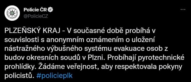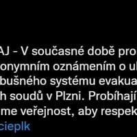 "V současné době probíhá v souvislosti s anonymním oznámením o uložení nástražného výbušného systému evakuace osob z budov okresních soudů v Plzni. Probíhají pyrotechnické prohlídky. Žádáme veřejnost, aby respektovala pokyny policistů," uvedla tisková mluvčí policie.