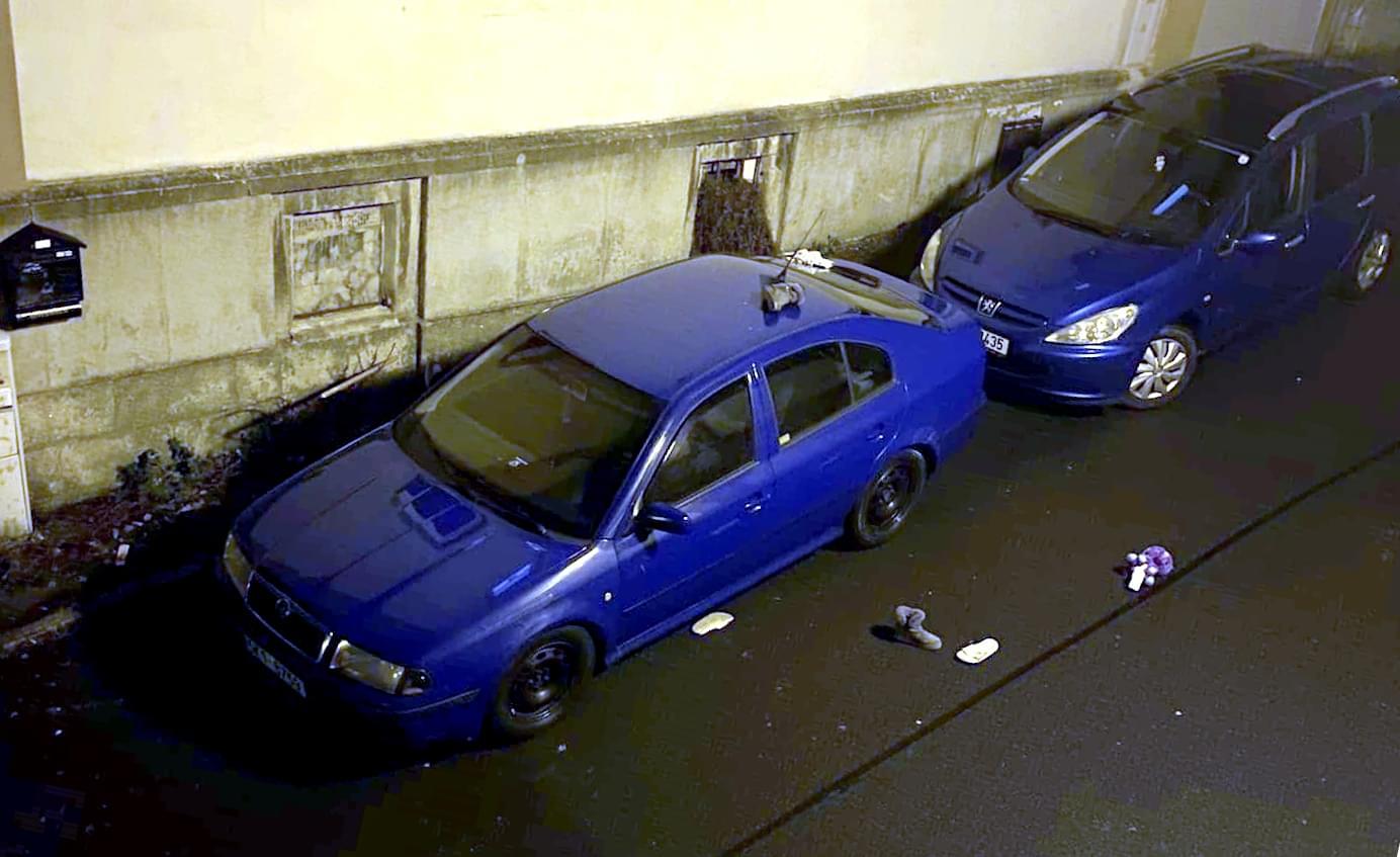 "Hlídka na místě zjistila, že na zaparkované auto někdo z domu vyházel předměty, konkrétně několik plyšáků, šroubky, oblečení a dřevěnou násadu z koštěte.