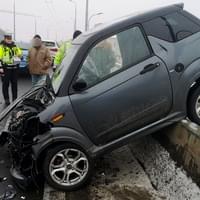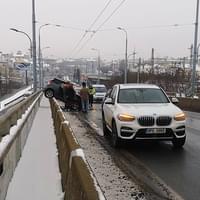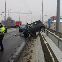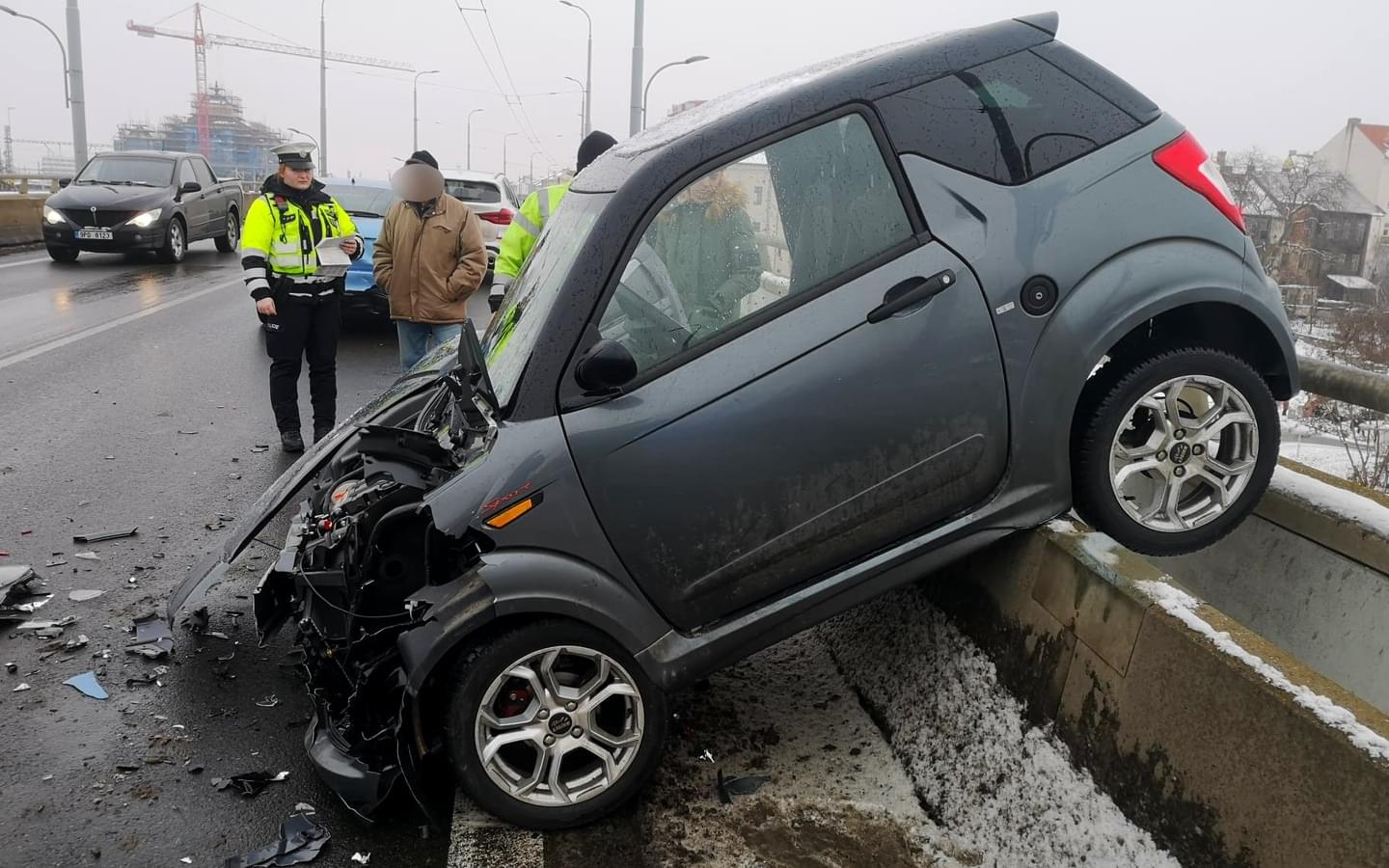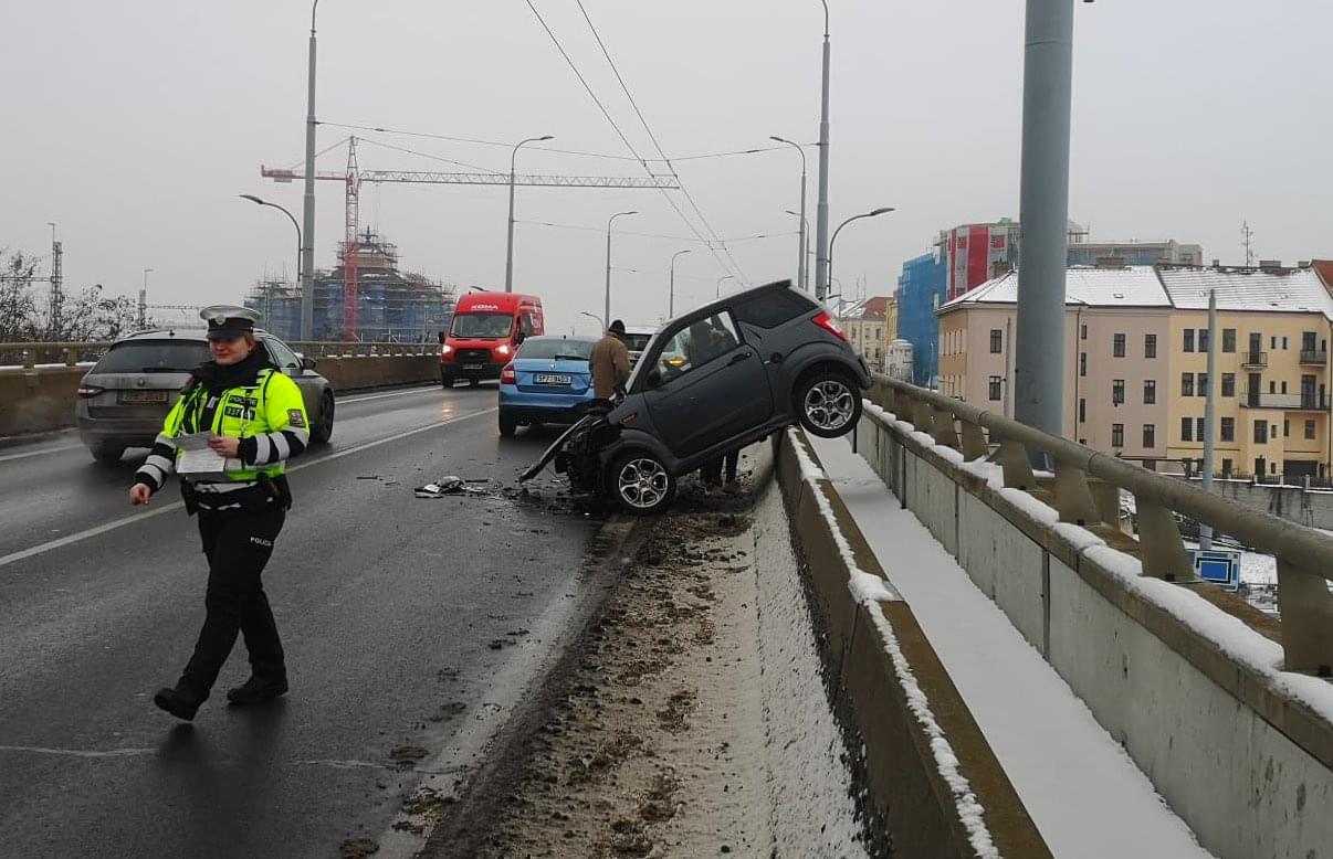 Dnes po půl druhé odpoledne došlo v Plzni na mostě Milénia k dopravní nehodě, při které zůstal jeden z vozů viset na svodidlech mostu.