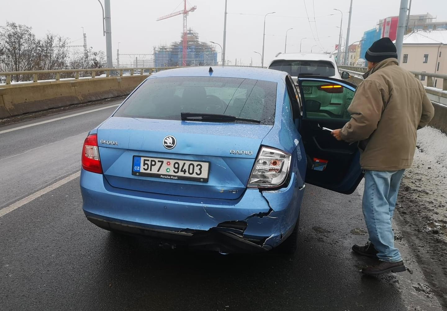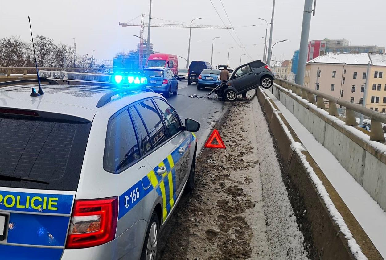 Nehoda se naštěstí obešla bez zranění, blokuje ale jeden pruh na mostě ve směru na Slovany a řidiči musí nehodu kyvadlově objíždět.