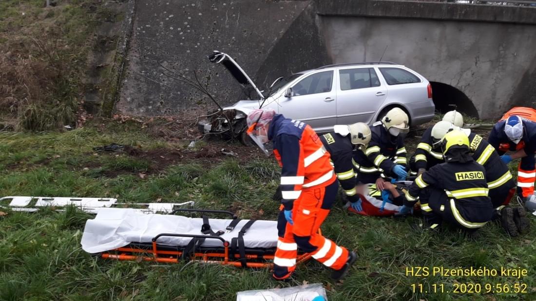 Vůz havaroval vedle mostu mimo silnici, jednu osobu z vozidla vyprostili hasiči a předali jí do péče záchranářů.