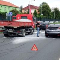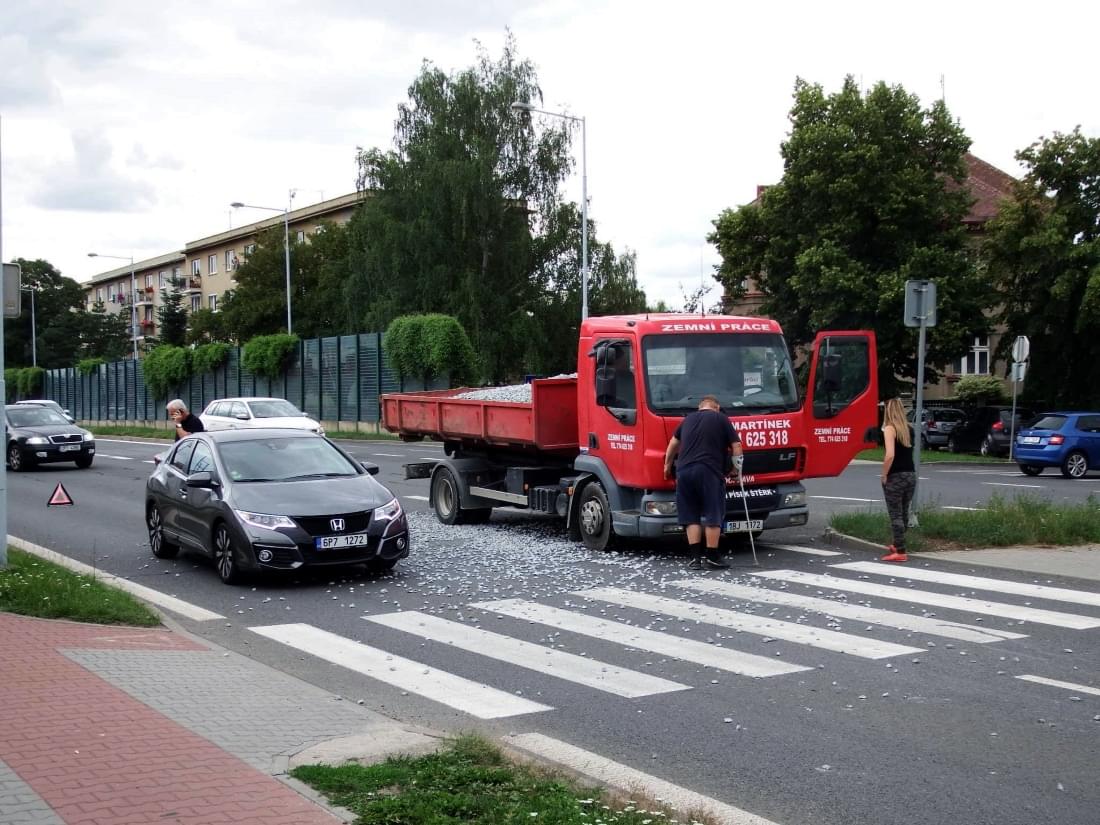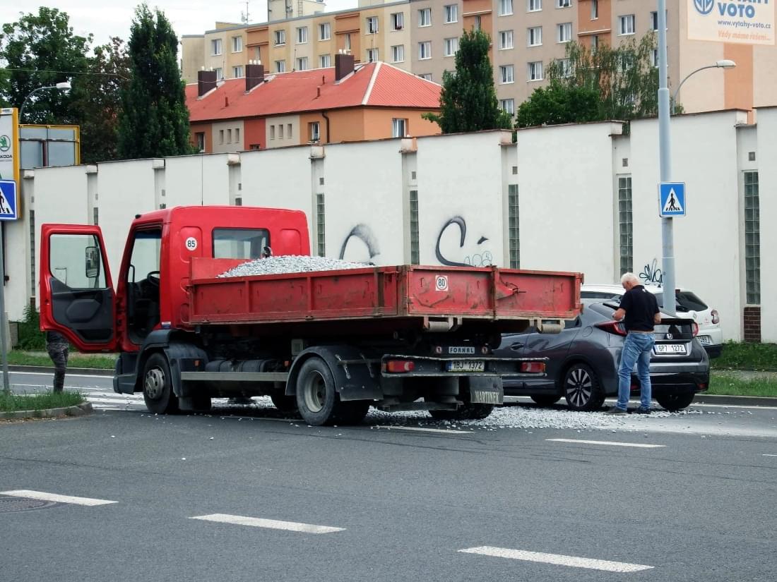 K první došlo v ulici Sukova, kde na křižovatce s ulicí Schwarzova řidič nákladního automobilu ze zatím neznámých příčin prudce zabrzdil a náklad štěrku, který vůz převážel na korbě, se nahrnul do přední části, část přepadla přes hranu korby a vysypala se na vedle jedoucí vozidlo Honda.