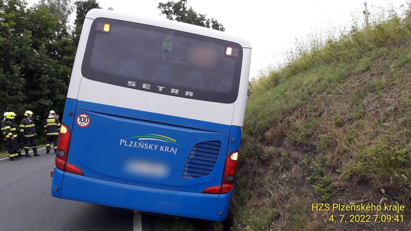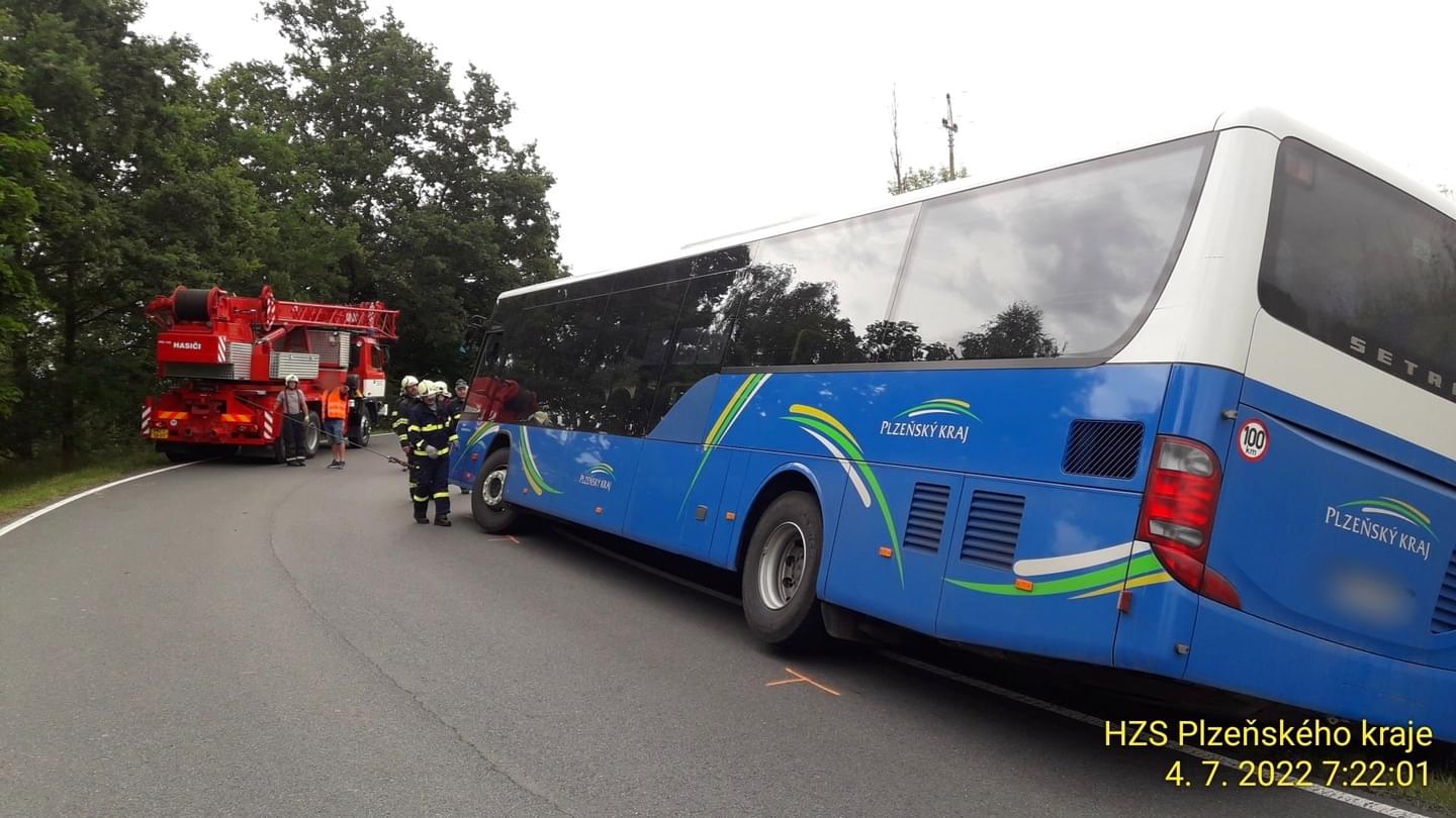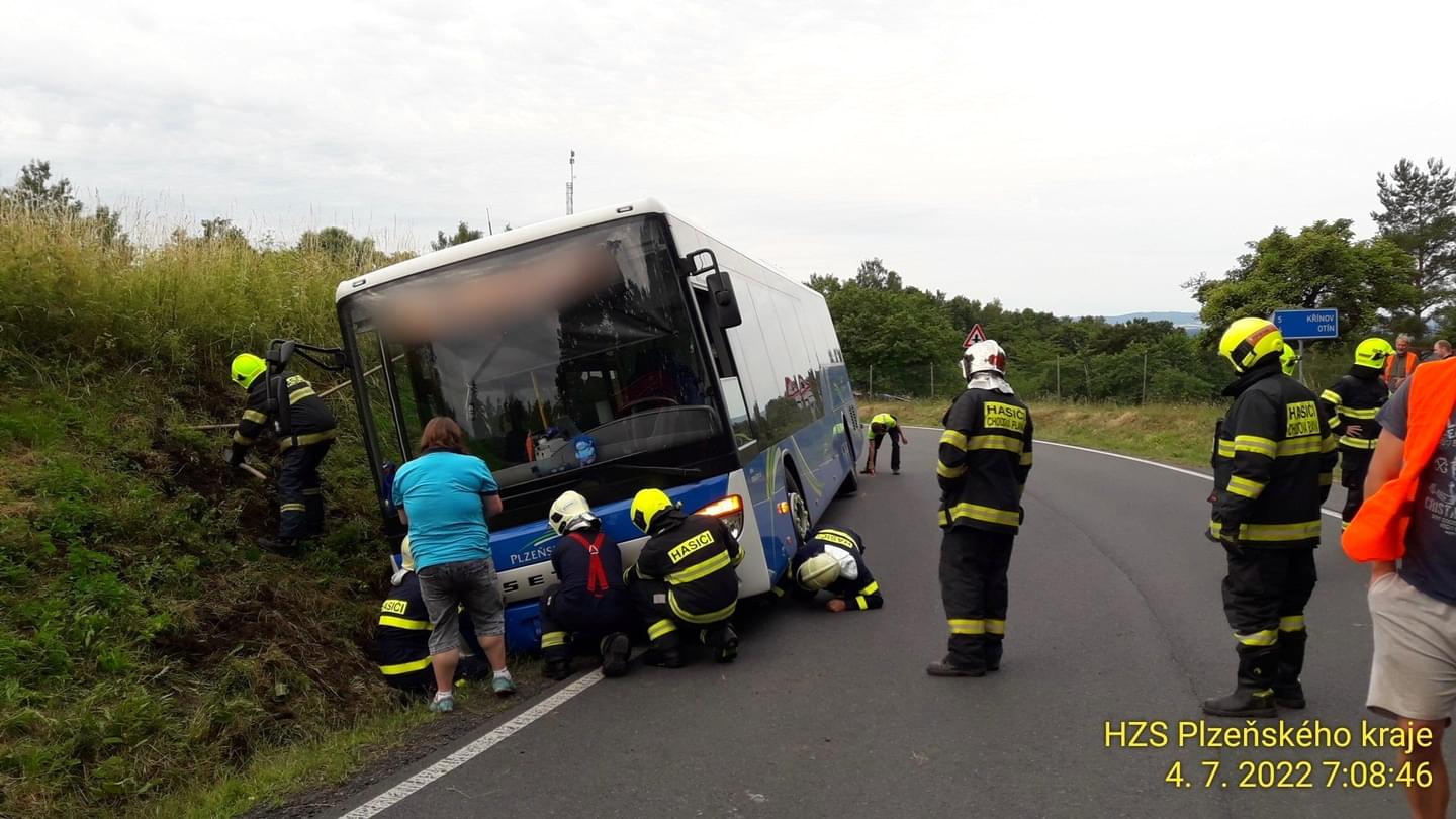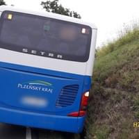 Dnes před sedmou hodinou rádo došlo u Chodové Plané na Tachovsku k dopravní nehodě linkového autobusu, který sjel do příkopu a zůstal nakloněn na stranu.