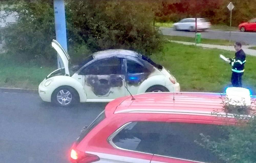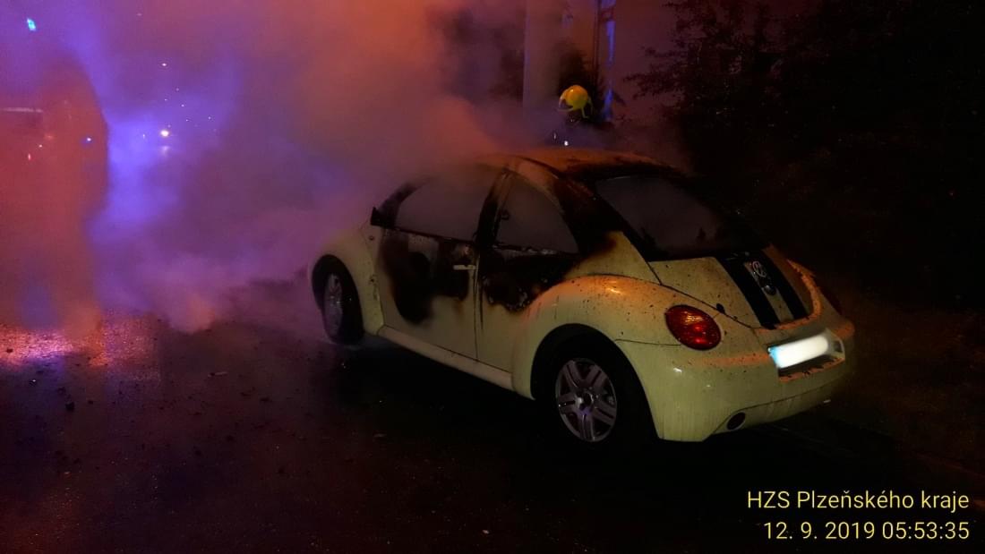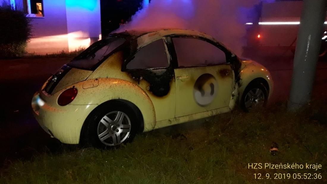 Dnes po půl šesté ráno vyjížděli hasiči k požáru osobního vozu New Beetle do Révové ulice v Plzni Doudlevcích.