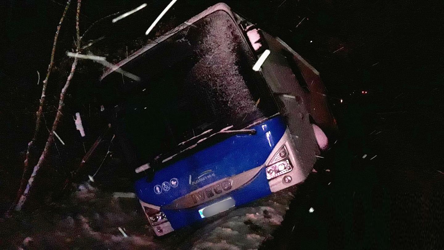 Z místa bylo hlášeno, že autobus je v příkopu, nakloněný na bok a mělo dojít ke zranění jedné osoby.