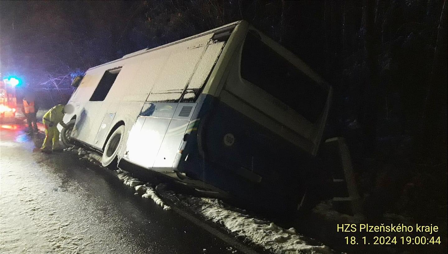 Dnes odpoledne před půl pátou došlo na silnici 193/II mezi Domažlicemi a Třebnicemi k havárii autobusu značky Iveco převážejícího asi dvě desítky cestujících.