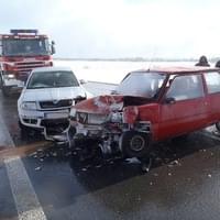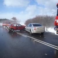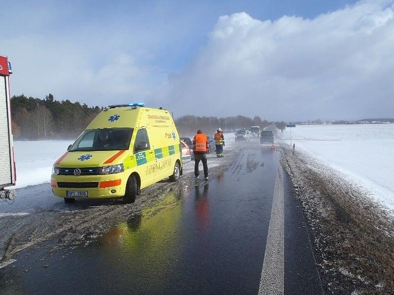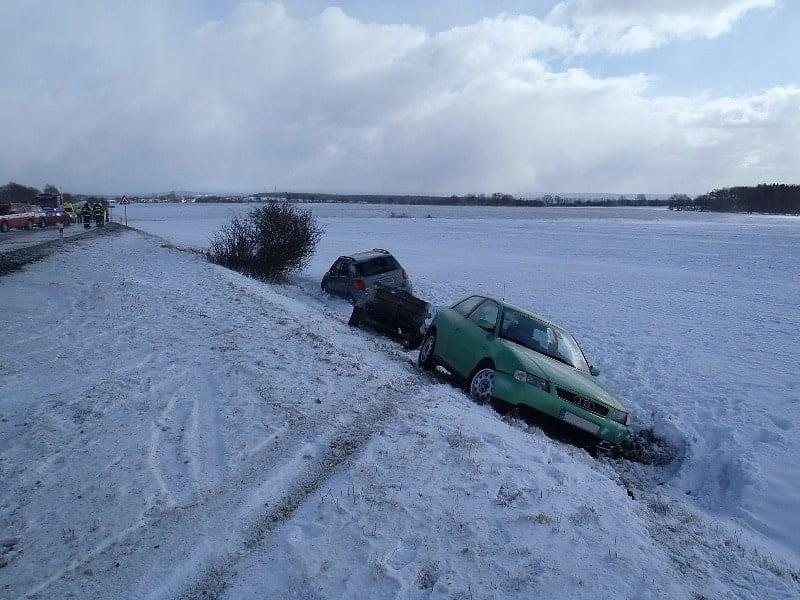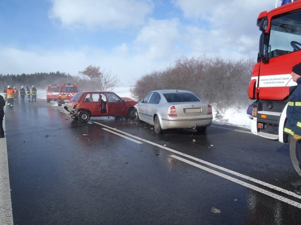 Nejvážnější nehodu jsme zaznamenali v poledne, za odbočkou na Chrančovice. Zde hasiči z Košutky zasahovali u nehody tří osobních aut. Dvěma dospělým osobám a malému dítěti hasiči poskytli předlékařskou péči a dítěti věnovali plyšovou hračku. Všechny tři zraněné předali hasiči do péče LZS a ZZS. Zásah ztěžovalo složkám IZS špatné počasí, zejména silný vítr, který vál sníh z pole přes silnici a viditelnost byla téměř nulová. Na místě se staly další nehody, dvě auta sjela z vozovky do pole. Tyto nehody se obešly bez zranění, z vozidel neunikly žádné provozní kapaliny. Posádkám hasiči zajistili tepelný komfort. Velitel zásahu rozhodl uzavřít hlavní tah Plzeň-KV v obou směrech a policisté zajistili odklon dopravy.