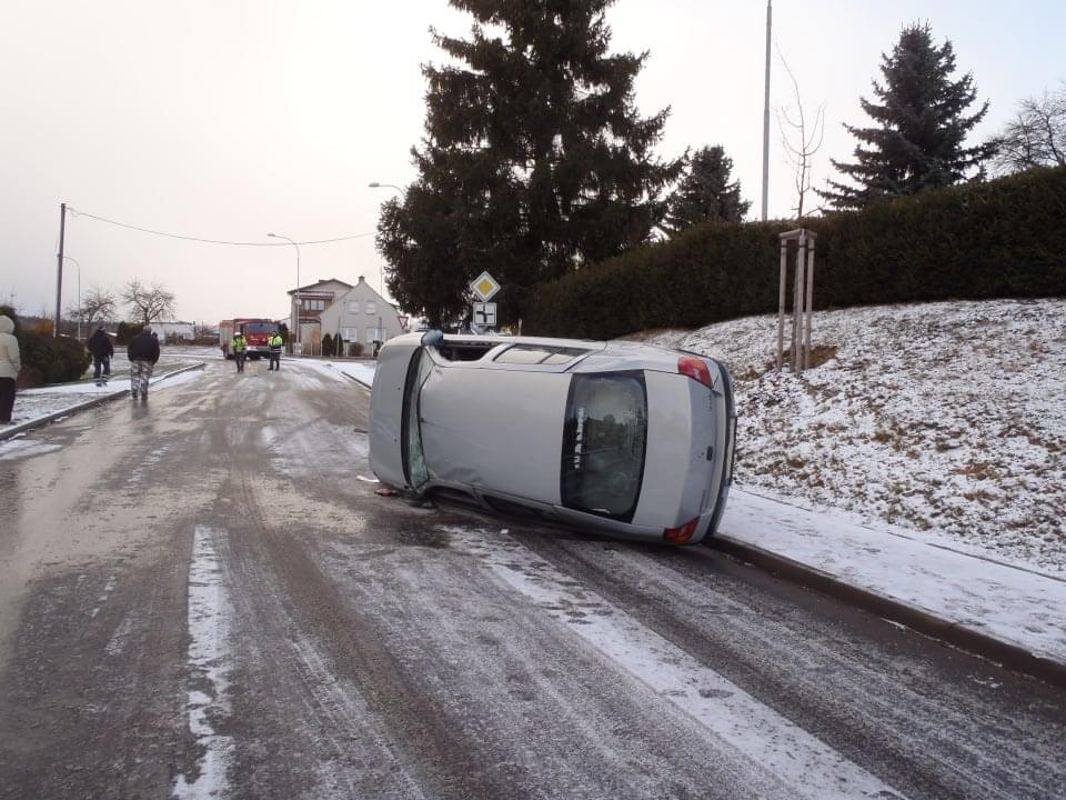 Ve stejnou dobu hasiči z Domažlic zajistili v Blížejově místo nehody osobního auta, které se převrátilo na bok. Z vozidla neunikly žádné provozní kapaliny. Po naložení vozidla na odtahovou službu hasiči uklidili z vozovky zeminu a trosky nabouraného auta. Nehoda si vyžádala jedno zranění.