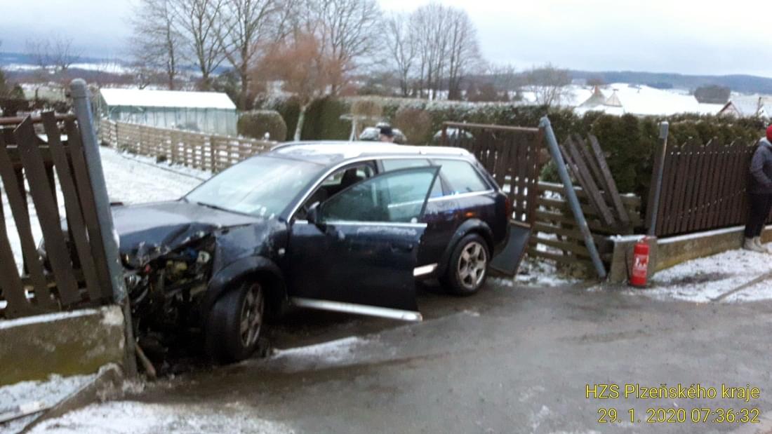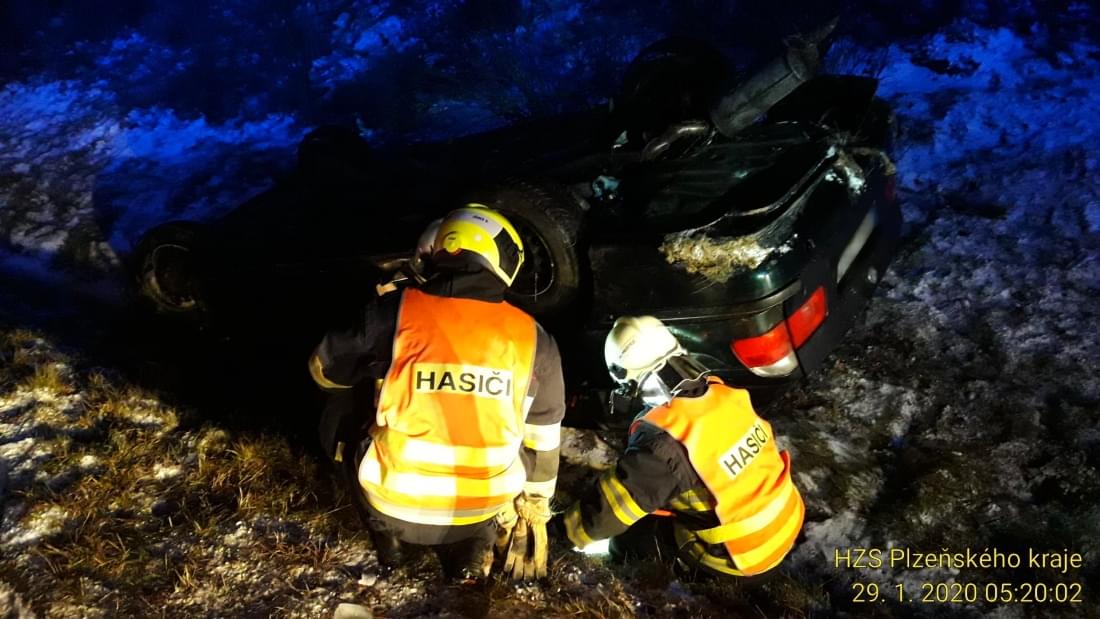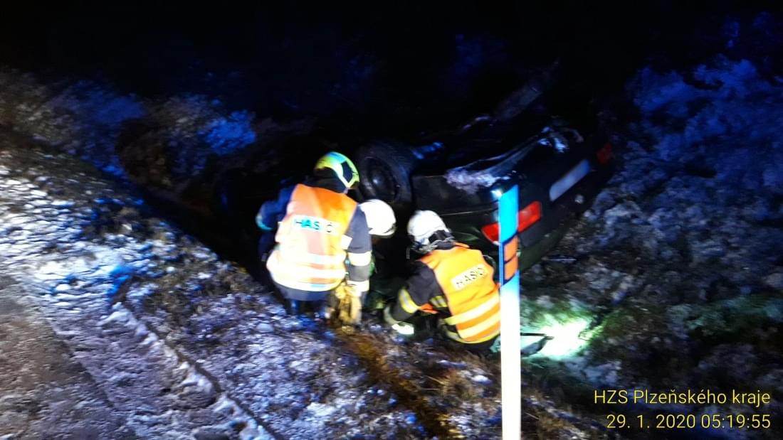 Před pátou hodinou ráno došlo na hlavním tahu na Klatovy na úrovni Šlovic k havárii osobního vozu, které se převrátilo do příkopu a zůstalo na střeše. Jedna osoba skončila v péči záchranářů. Hasiči zajistili místo události a zlikvidovali drobný úkap pohonných hmot.