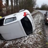 Auto zde vyjelo ze silnice, převrátilo se přes střechu a zůstalo na boku v silničním příkopu. šlo přes střechu a je mimo komunikaci.