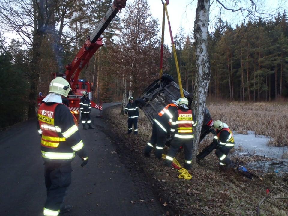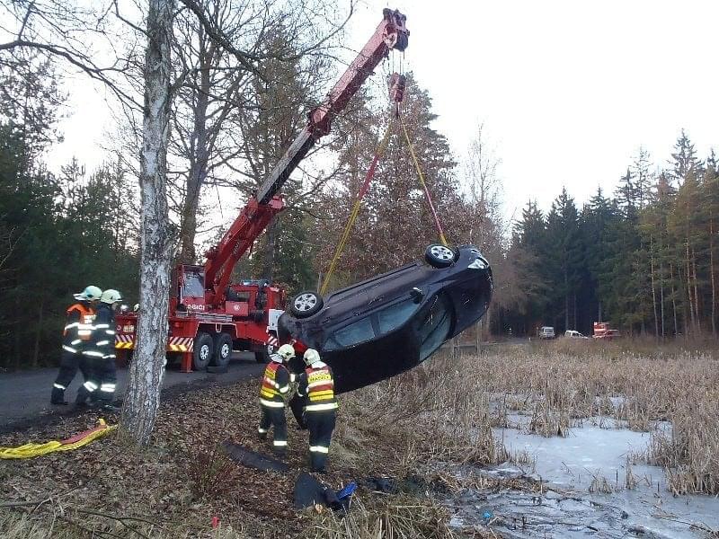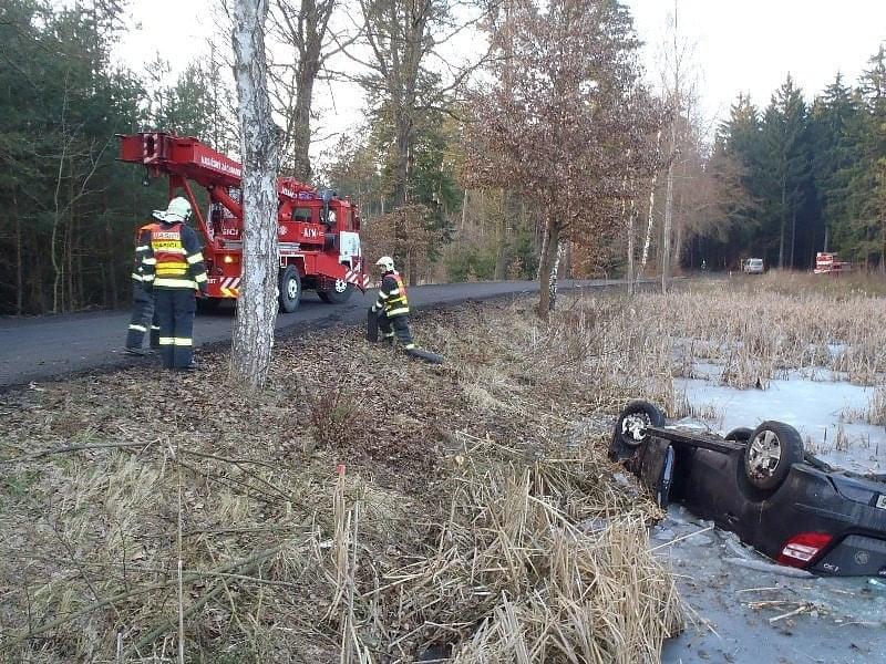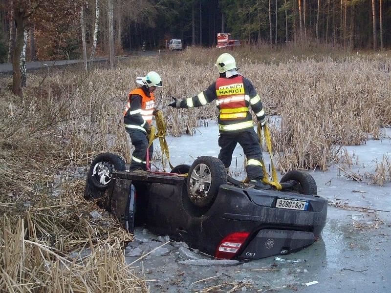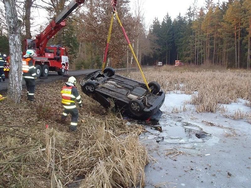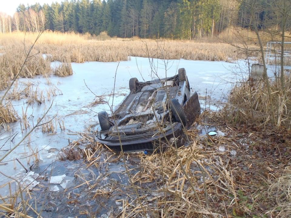 Odpoledne, před čtvrtou hodinou, zasahovali hasiči opět u vozidla v rybníce. Nyní to byli Rokycanští hasiči a bylo to za Litohlavami, ve směru na Smědčice. Při příjezdu jednotky hasičů na místo události, byla řidička, která z hrozivě vypadající nehody vyvázla bez zranění, již z vozu venku a seděla v teple ve voze policistů. Hasiči ženě poskytli deky na zahřátí. Její vozidlo na tom bylo podstatně hůře, leželo v rybníce na střeše, zhruba do poloviny zatopené vodou. Na jeho vyproštění si velitel zásahu povolal jeřáb a na místo vyjela jednotka SŽDC Plzeň s vyprošťovacím automobilem. Vozovka byla uzavřena po dobu vyprošťování.