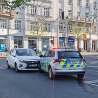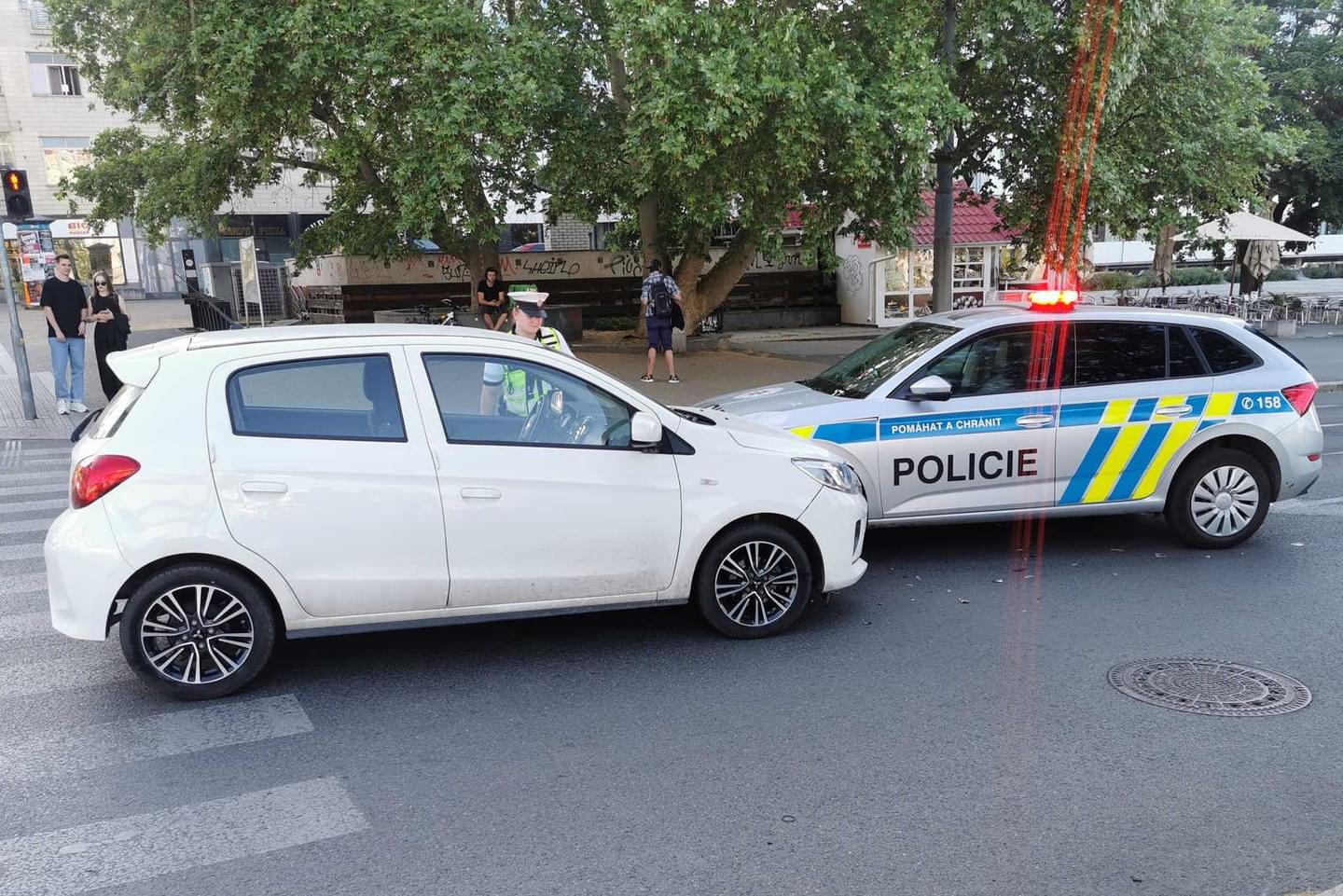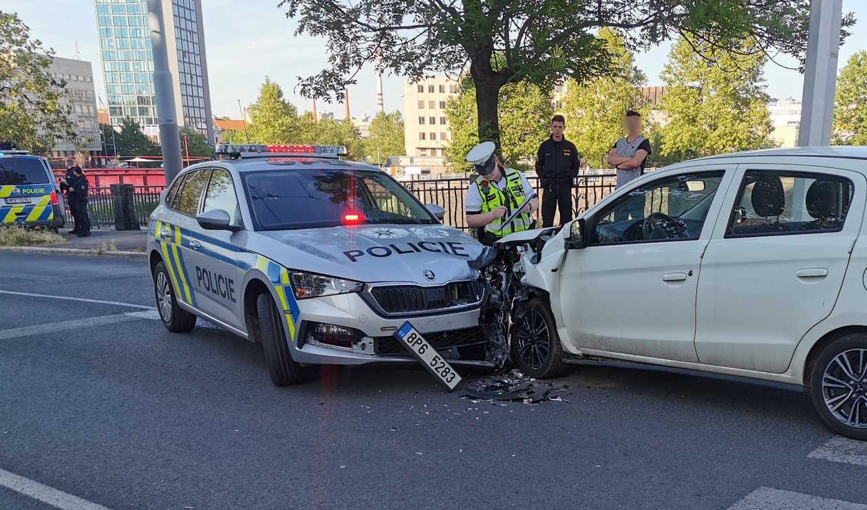 Dnes před půl sedmou večer došlo na křižovatce Americká třída a Anglické nábřeží k dopravní nehodě, při které se střetly dva vozy, konkrétně Mitsubishi se Škodou v barvách Policie ČR.
