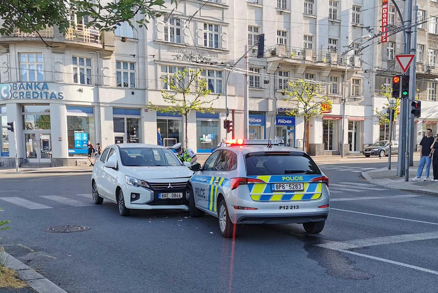 Podle informací přímo z místa, vjížděl vůz značky Mitsubishi do křižovatky sice na zelenou, ale jeho řidič zřejmě přehlédl policejní vůz se zapnutými majáky jedoucí k případu z Anglického nábřeží na Americkou třídu.