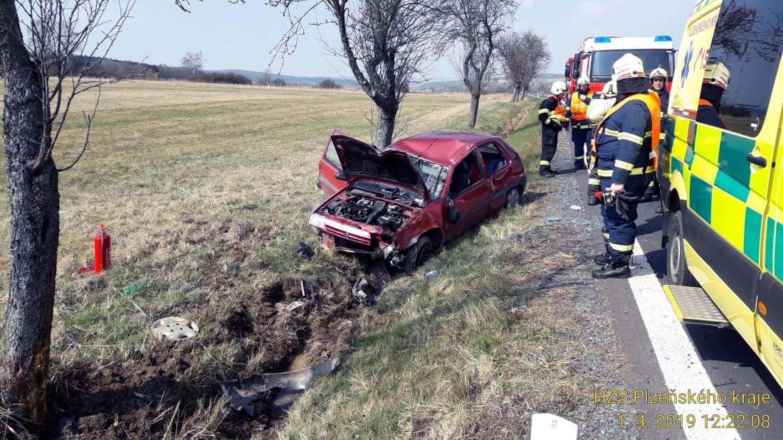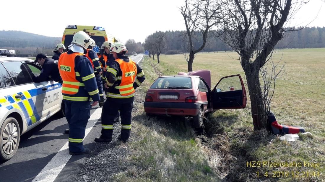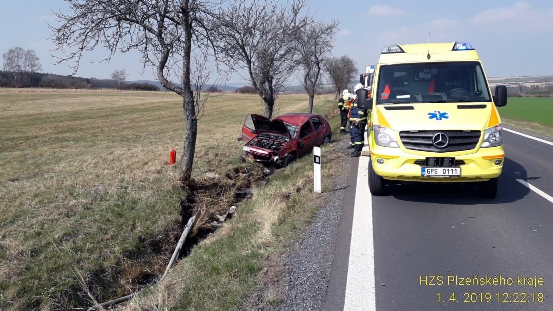 K havárii osobního vozu Citroen vyjížděly po poledni všechny záchranné složky na křižovatku mezi Spálené Poříčí, Hořehledy a Nové Mitrovice, kde řidič vozu Citroen Saxo vyjel do protisměru, narazil do dopravní značky a do stromu a poté havaroval v příkopu.