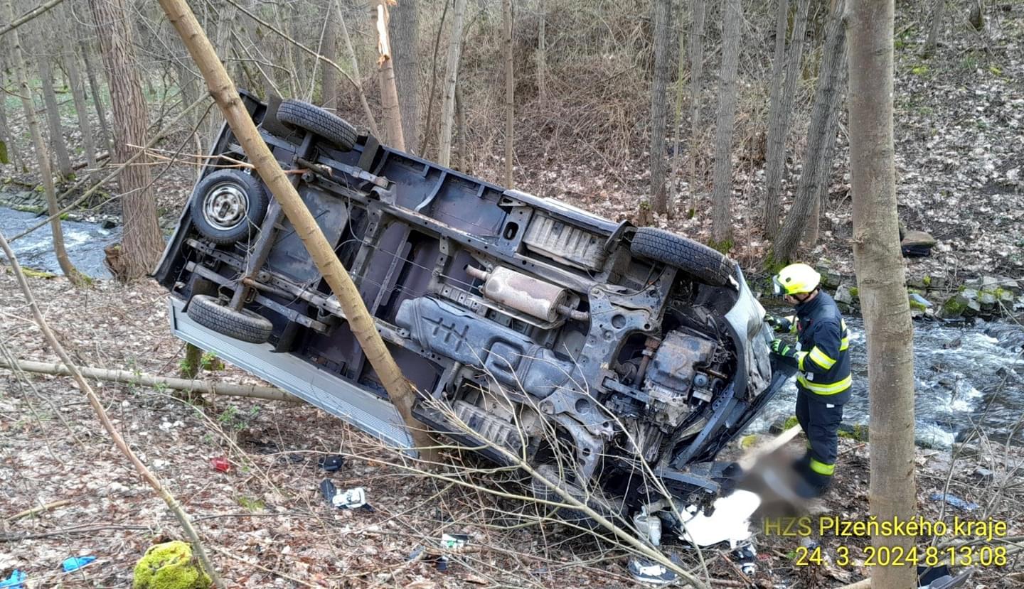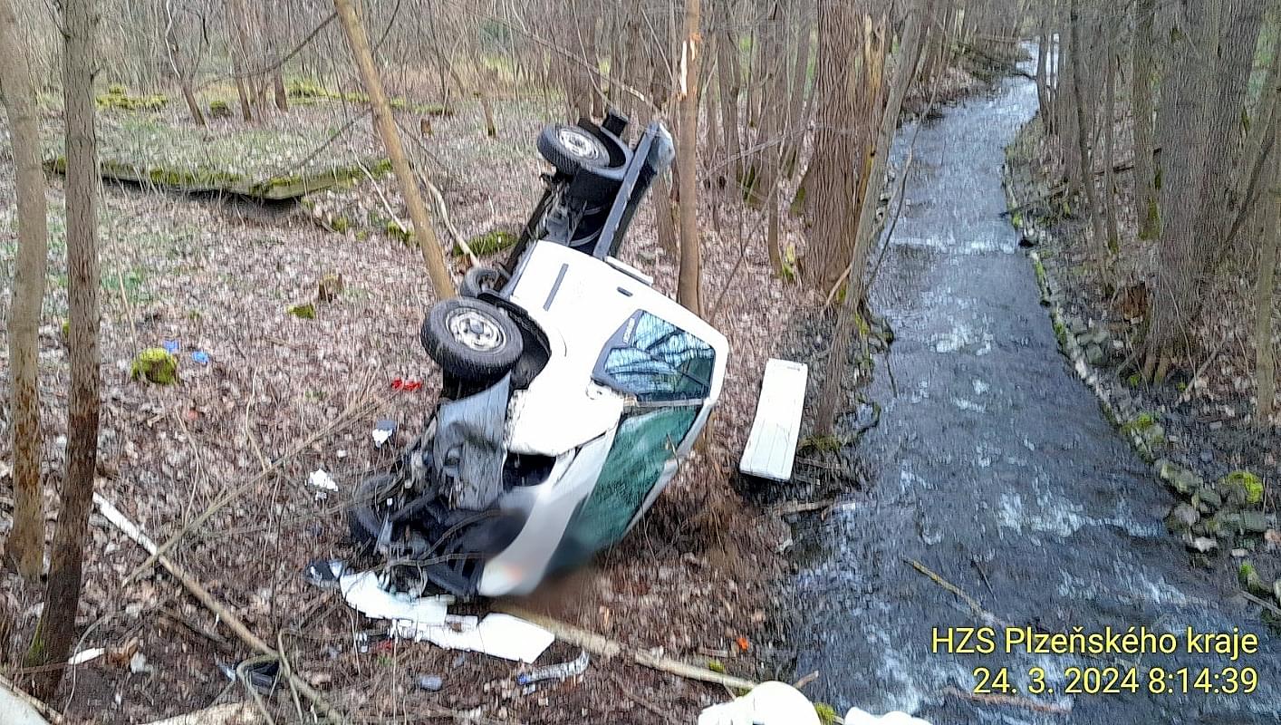 Včera kolem osmé hodiny ráno došlo na silnici 198, u Oldřichova na Tachovsku, nedaleko Jirského rybníka k dopravní nehodě, během které dodávka Ford vyjela ze silnice, skutálela se ze svahu a nakonec převrátila mezi stromy na břeh potoka.