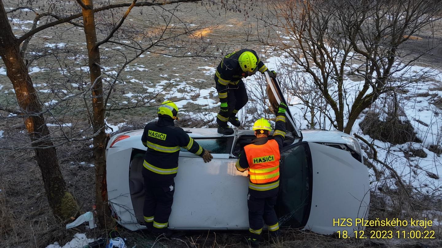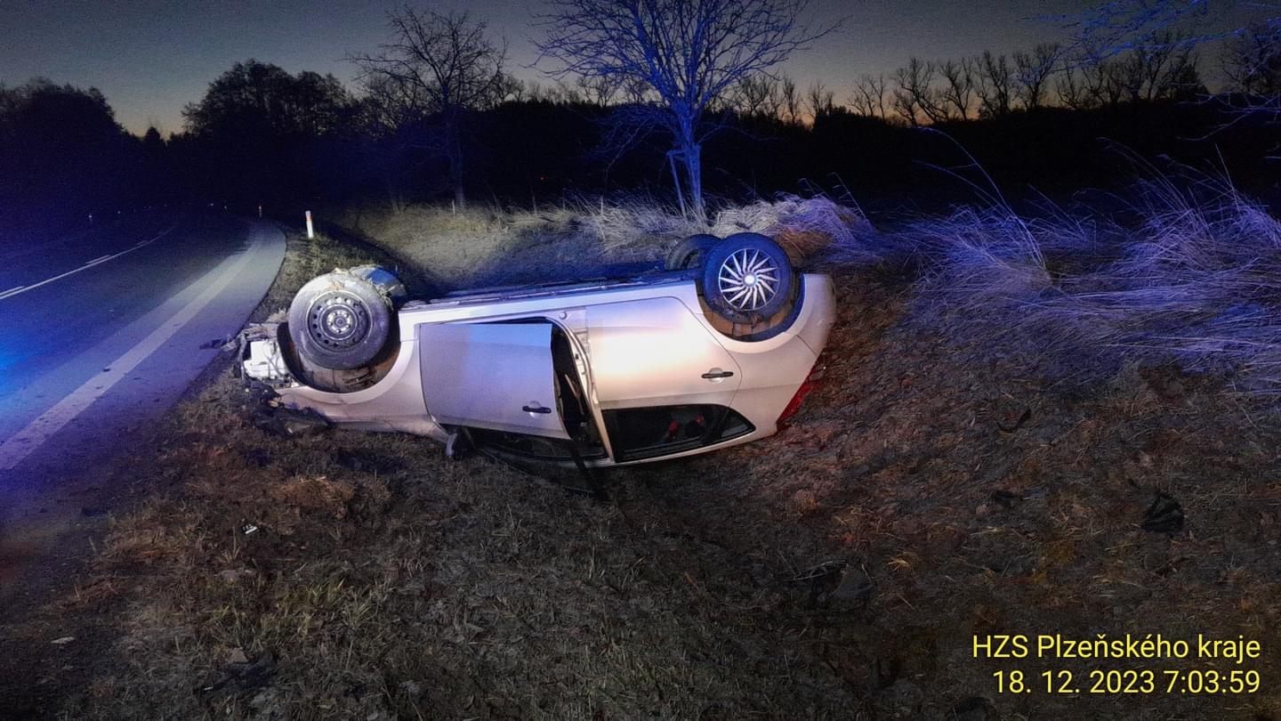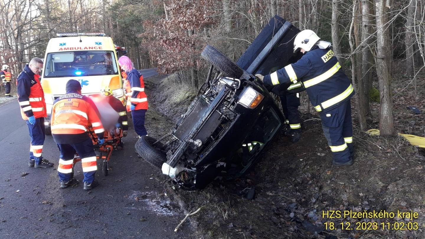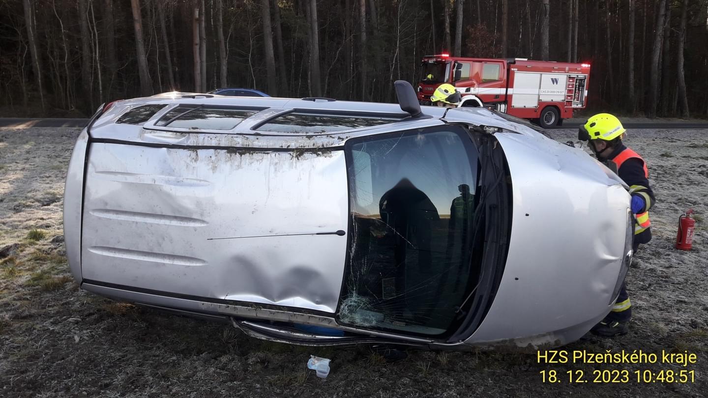 10:38 Mezi Kokašicemi a Horními Kozolupy havarovalo další osobní auto a opět skončilo převrácené mimo silnici. Záchranáři si do péče převzali jednoho zraněného.