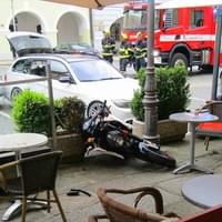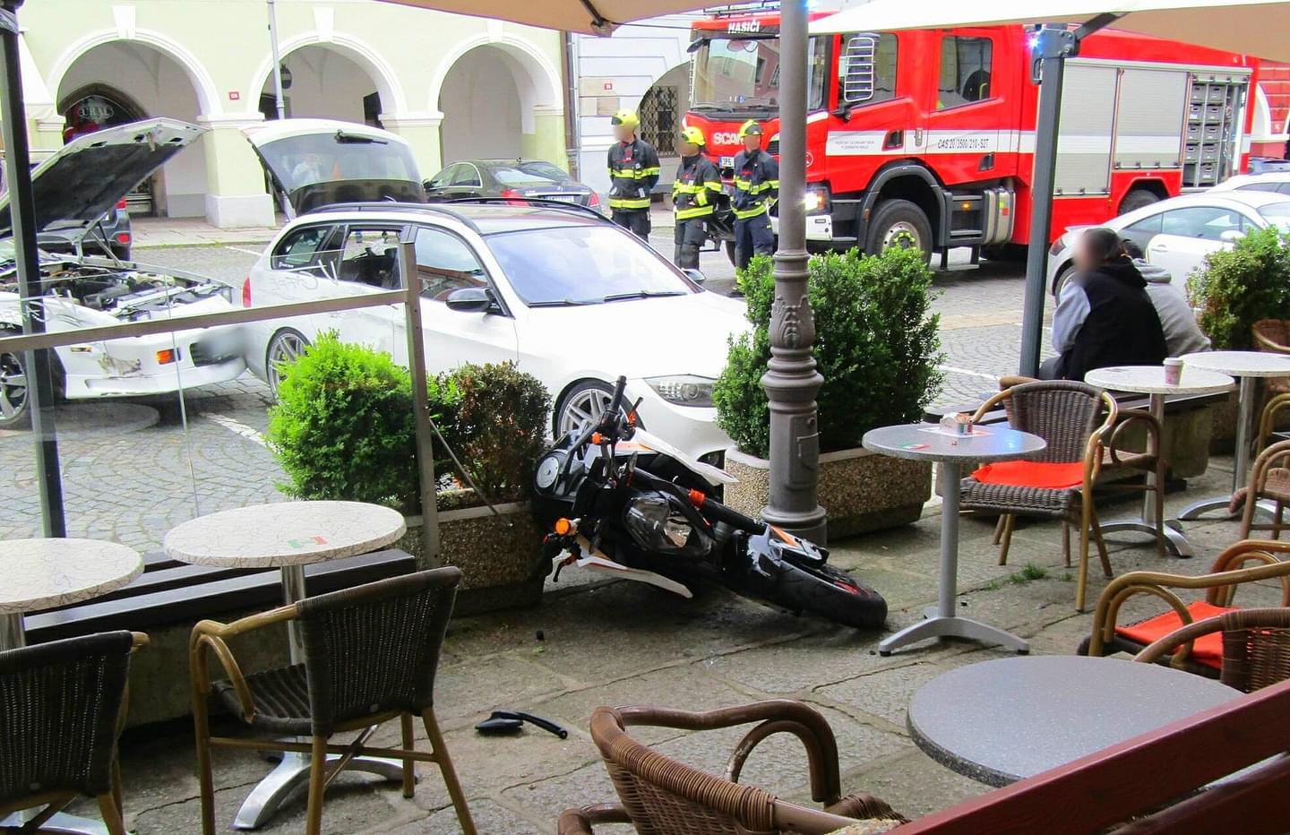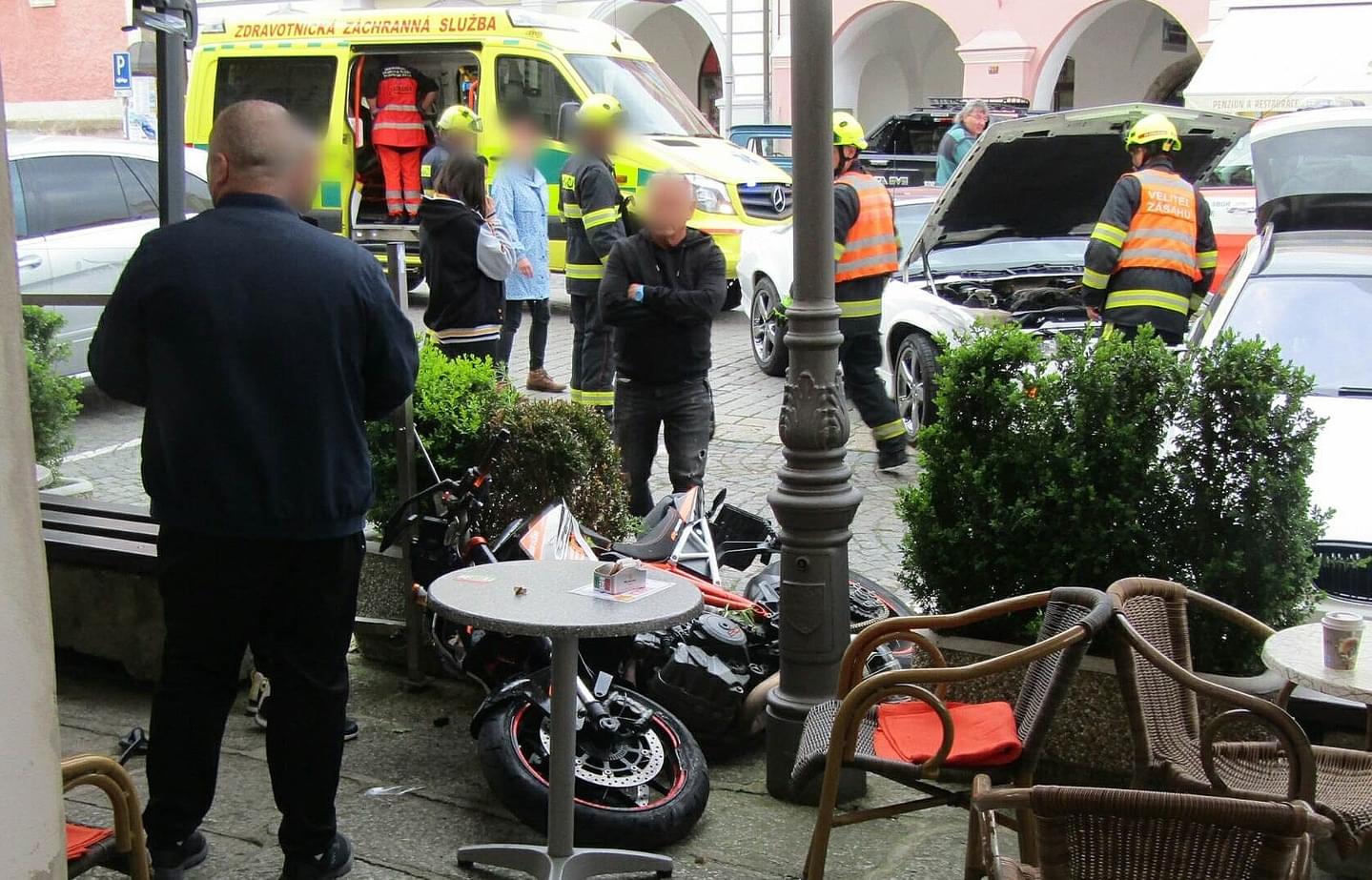 Včera večer vyjížděly všechny záchranné složky na náměstí do Domažlic, kde se motorkář střetl se dvěma auty a poté skončil na terase kavárny, kde zranil jednoho z hostů.