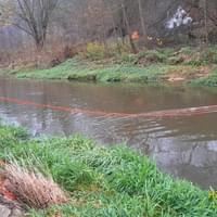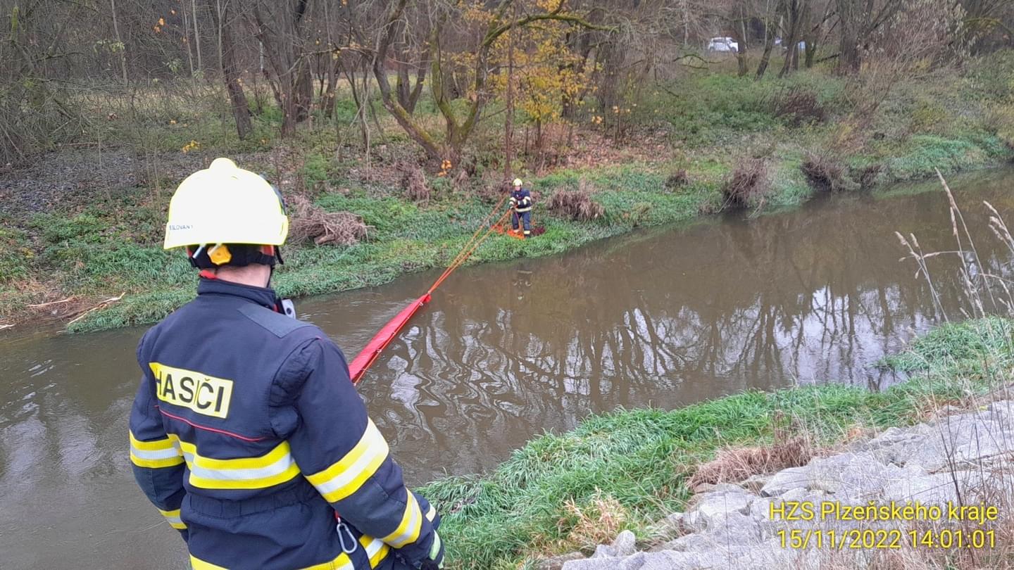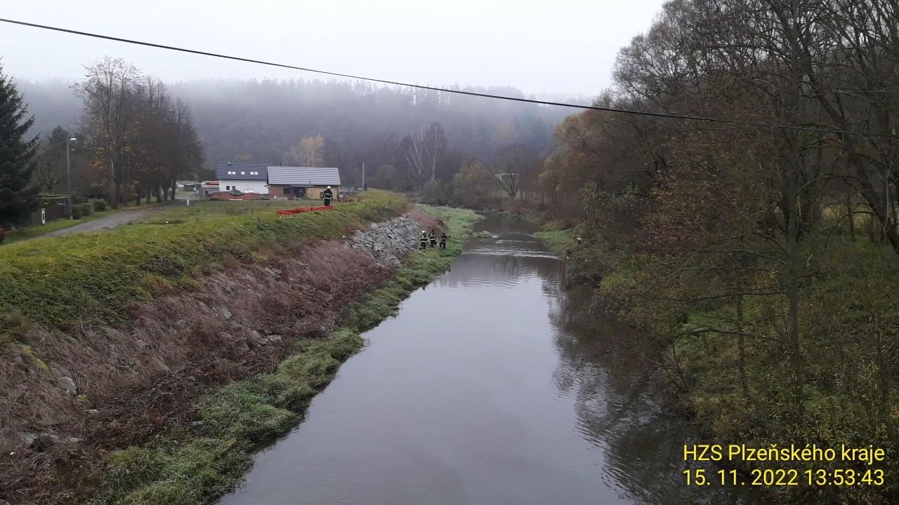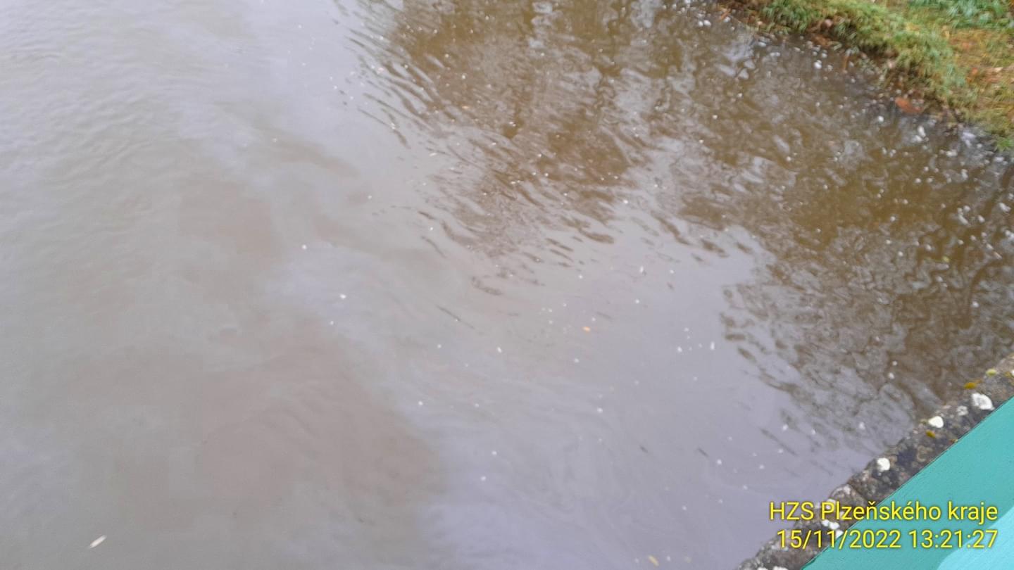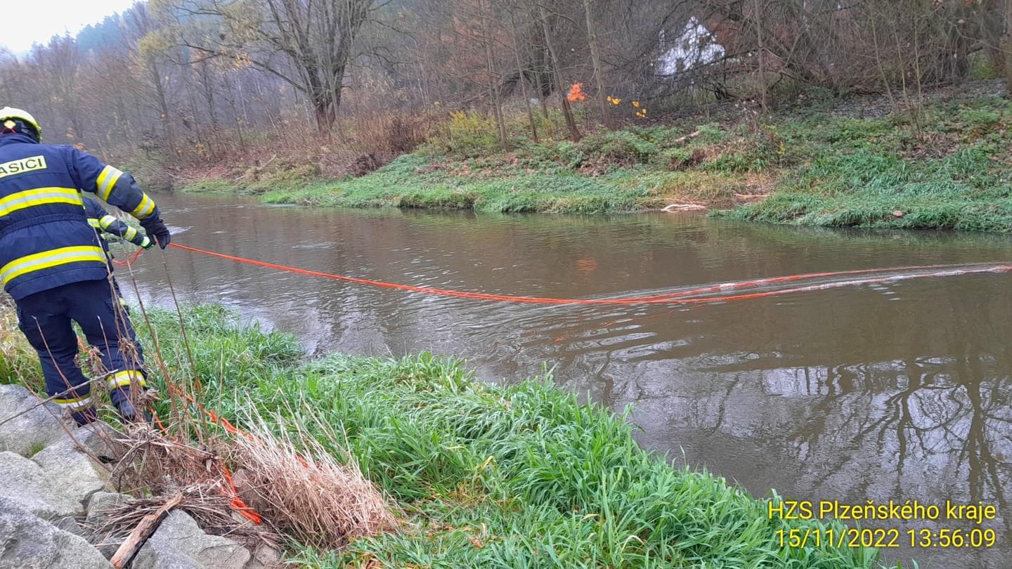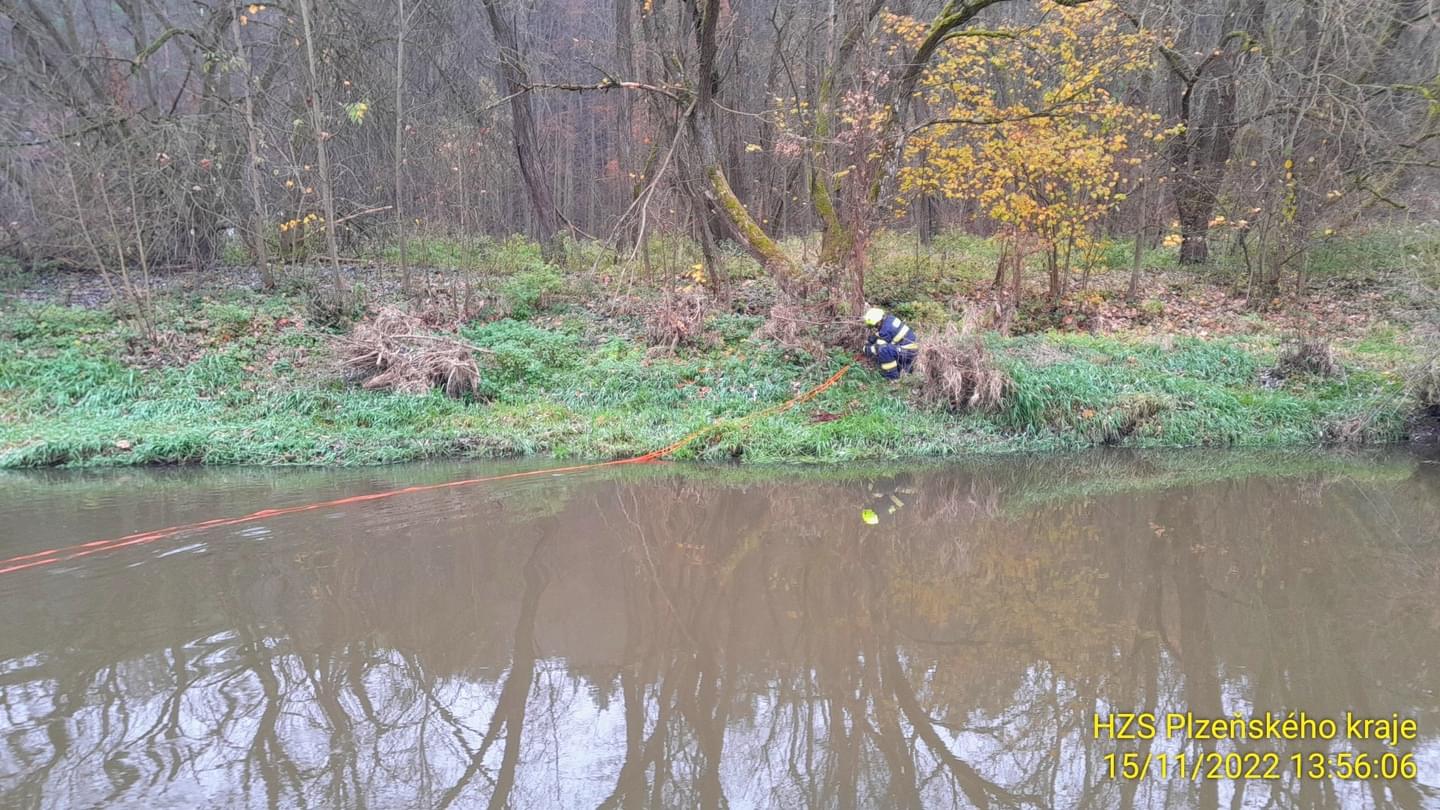 Právě v tuto chvíli zasahují hasiči ze tří jednotek a laboratoře Třemošná v Nové Huti u Dýšiné, kde došlo k úniku zřejmě nafty do řeky Klabavy.