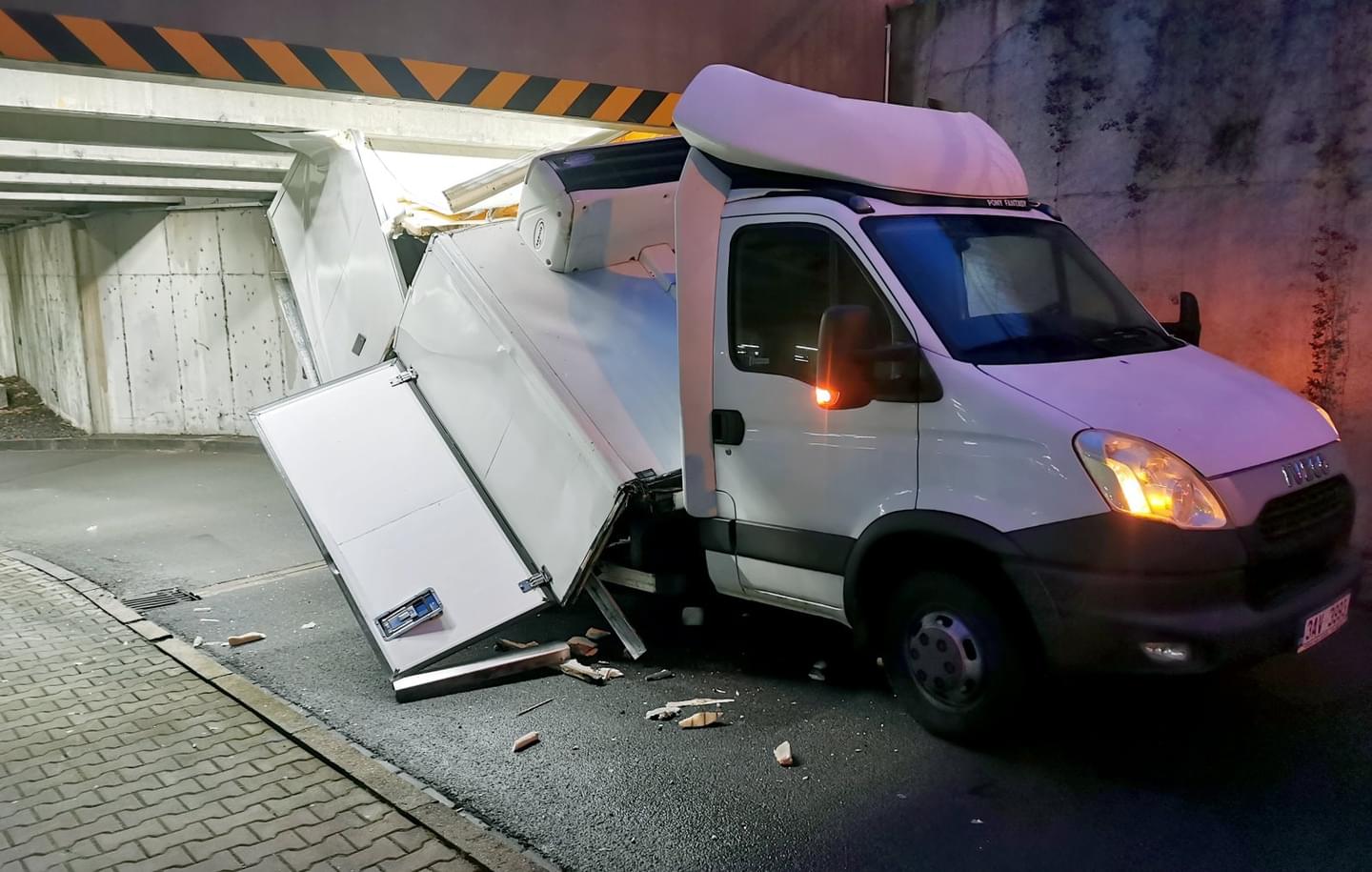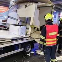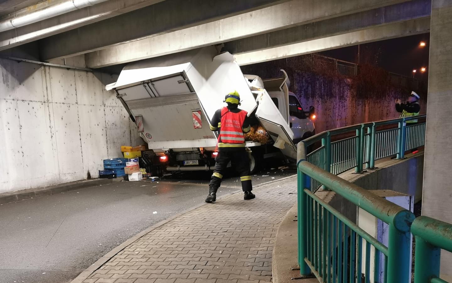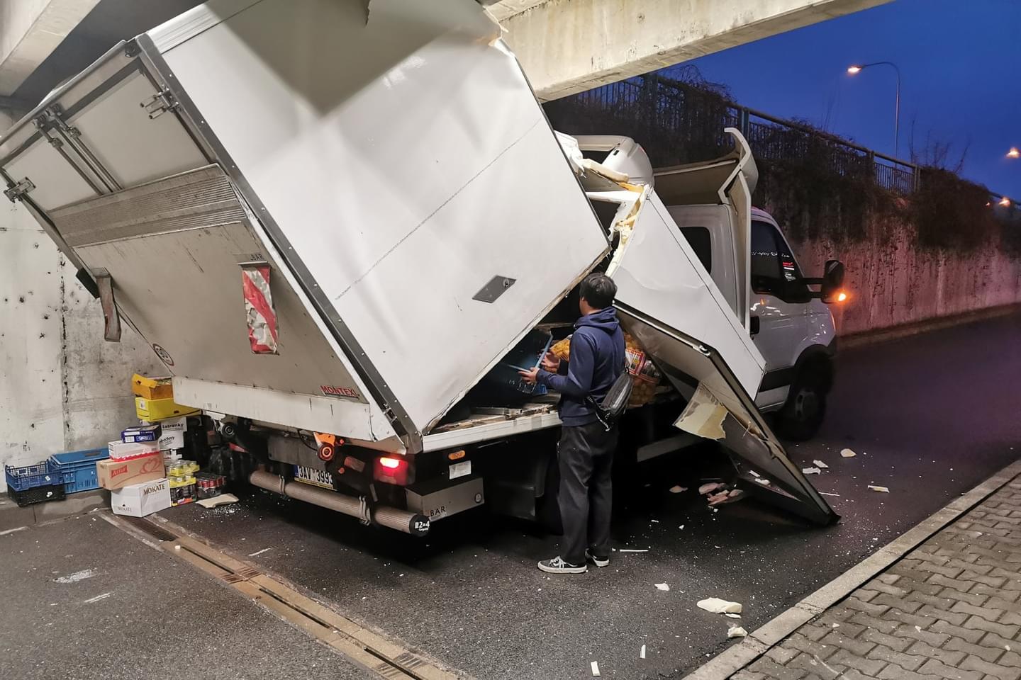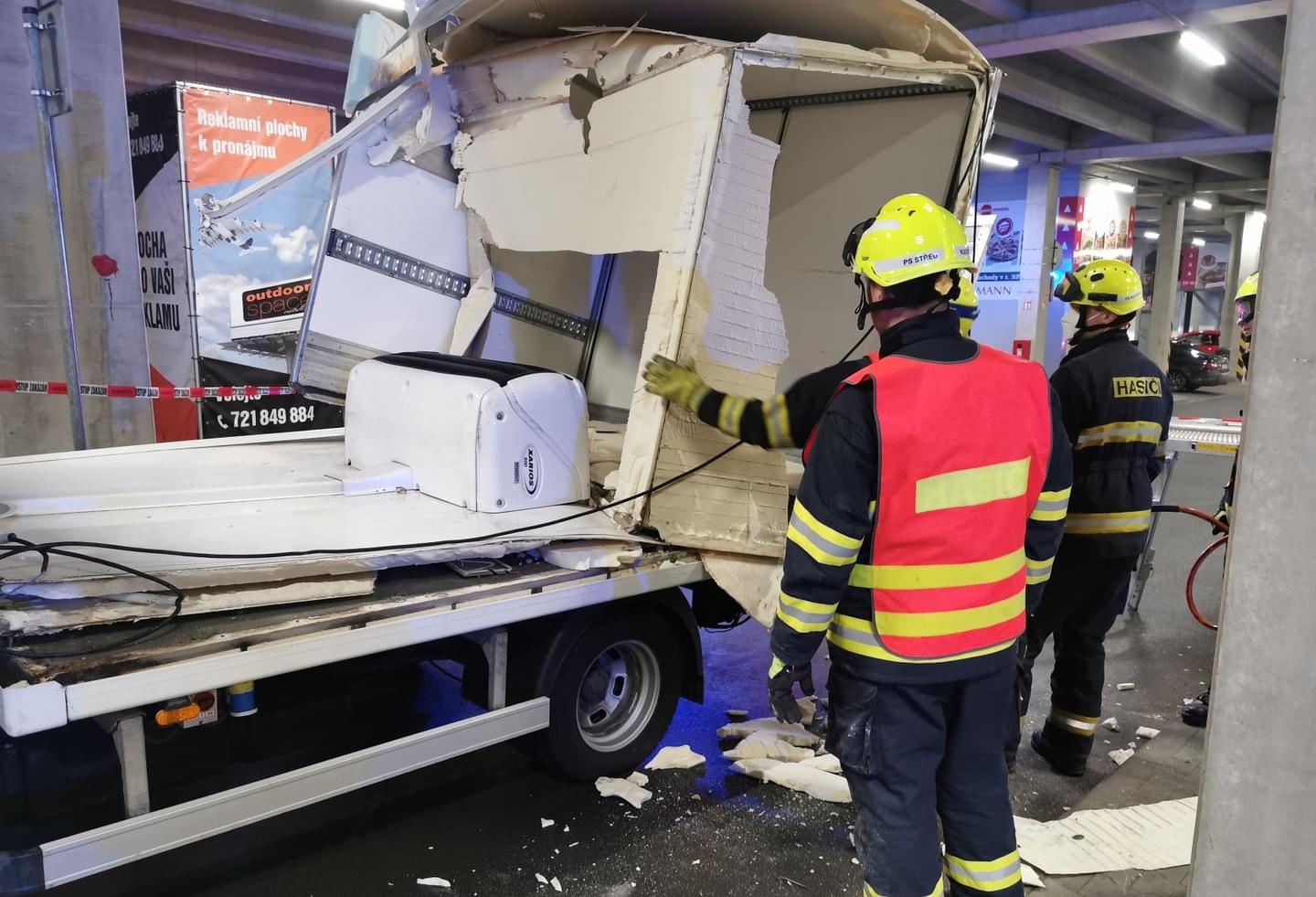 Následný náraz nástavby dodávky do pilíře ji pak zcela zničil a vozidlo na místě zůstalo zaklíněné. Nehoda se naštěstí obešla bez zranění. Na místo vyjeli dopravní policisté a hasiči, kteří zabezpečili místo nehody a po zadokumentování a zaprotokolování nehody policií vozidlo vyprostili a spustili zpět na parkoviště, kde následně museli zbytky nástavby rozřezat a rozstříhat.