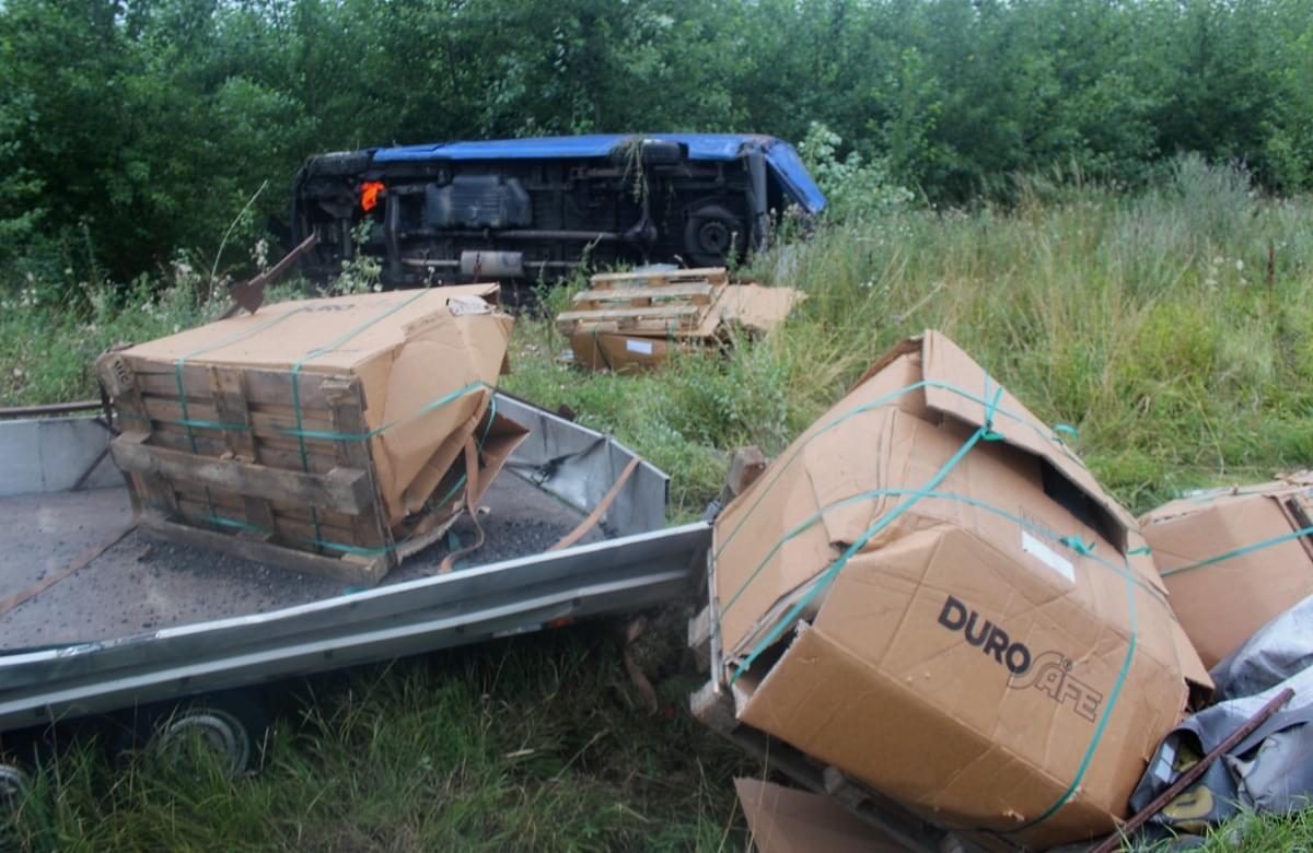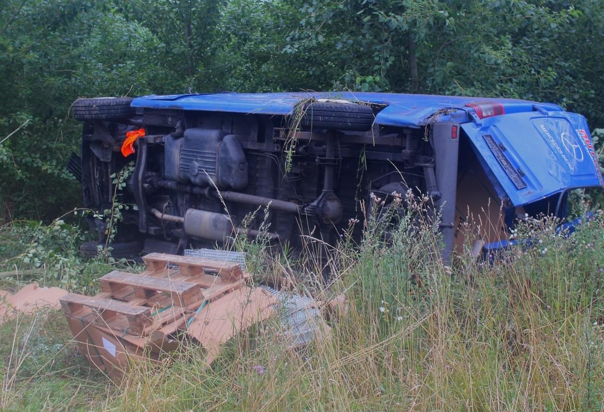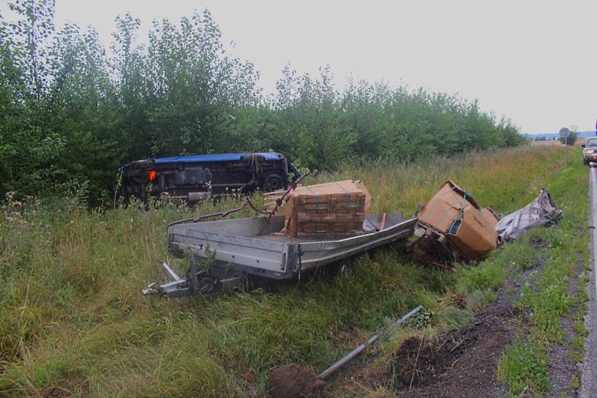 Dnes kolem šesté hodiny večer došlo k dopravní nehodě dodávky na dálničním přivaděči v Blatnici. Dodávka Mercedes s vlekem naložená kovovými rošty jela ve směru od Nýřan. Podle všeho se vlek s těžkým nákladem rozkomíhal, řidič se přibližně 50 metrů pokoušel udržet vozidlo ve smyku na silnici, ale bohužel to nezvládl, vyjel do protisměru, kde vozidlo přeletělo levý příkop a skončilo asi 15 metrů daleko v křoví na boku.