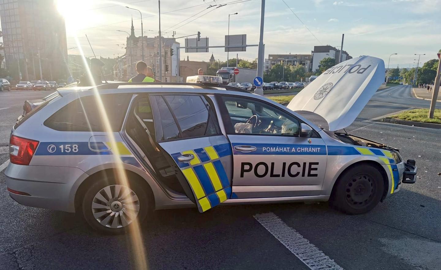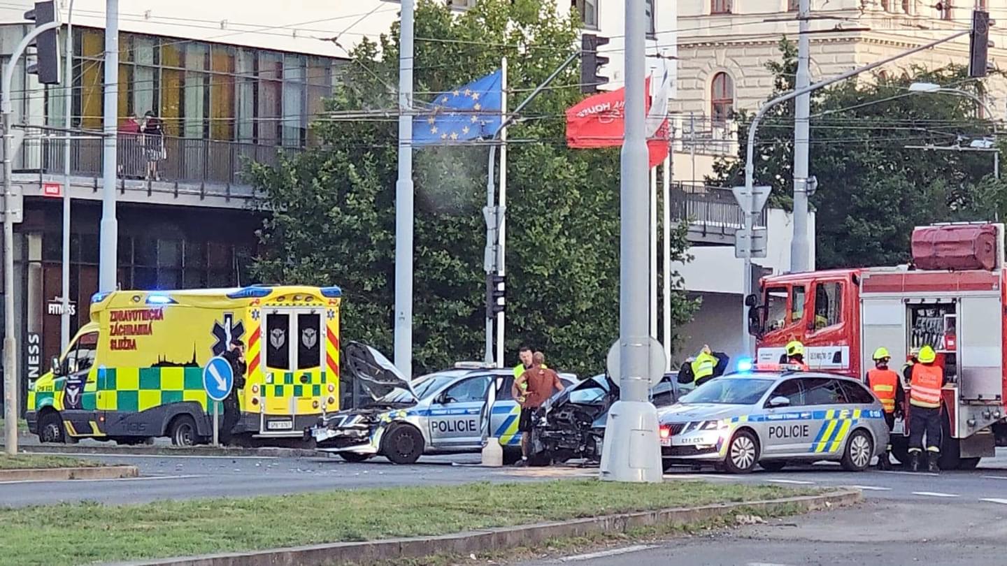 Podle mluvčí policie vjíždělo vozidlo policie do křižovatky směrem od Hlavního vlakového nádraží se zapnutým VRZ a mířilo k oznámenému případu. Ve stejné době do křižovatky vjelo na zelený signál i vozidlo Škoda Fabia, které jelo z Tyršovy ulice a došlo tak ke střetu obou vozidel.Dopravní policisté oba řidiče podrobili testu na přítomnost alkoholu s výsledkem negativním a nehodou se dále zabývají.