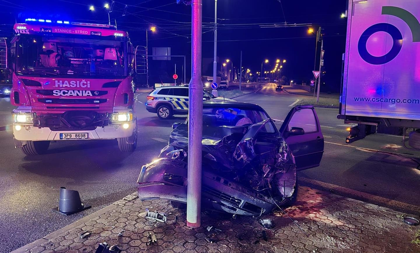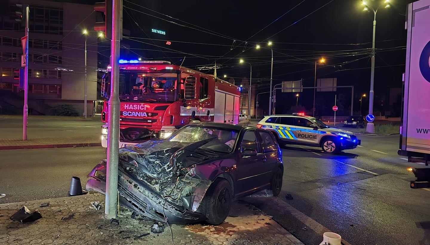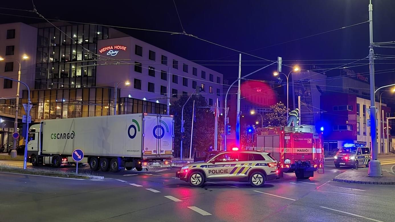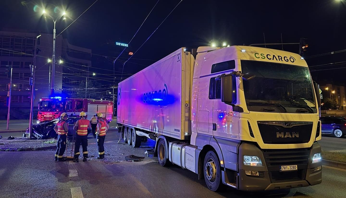 V noci na dnešek krátce po čtvrt na jednu došlo U Jána, tedy na křižovatce ulic Pražská, U Prazdroje, Tyršova a Ukrajinská v Plzni, k dopravní nehodě, během které se střetl osobní vůz Volkswagen Golf s kamionem.