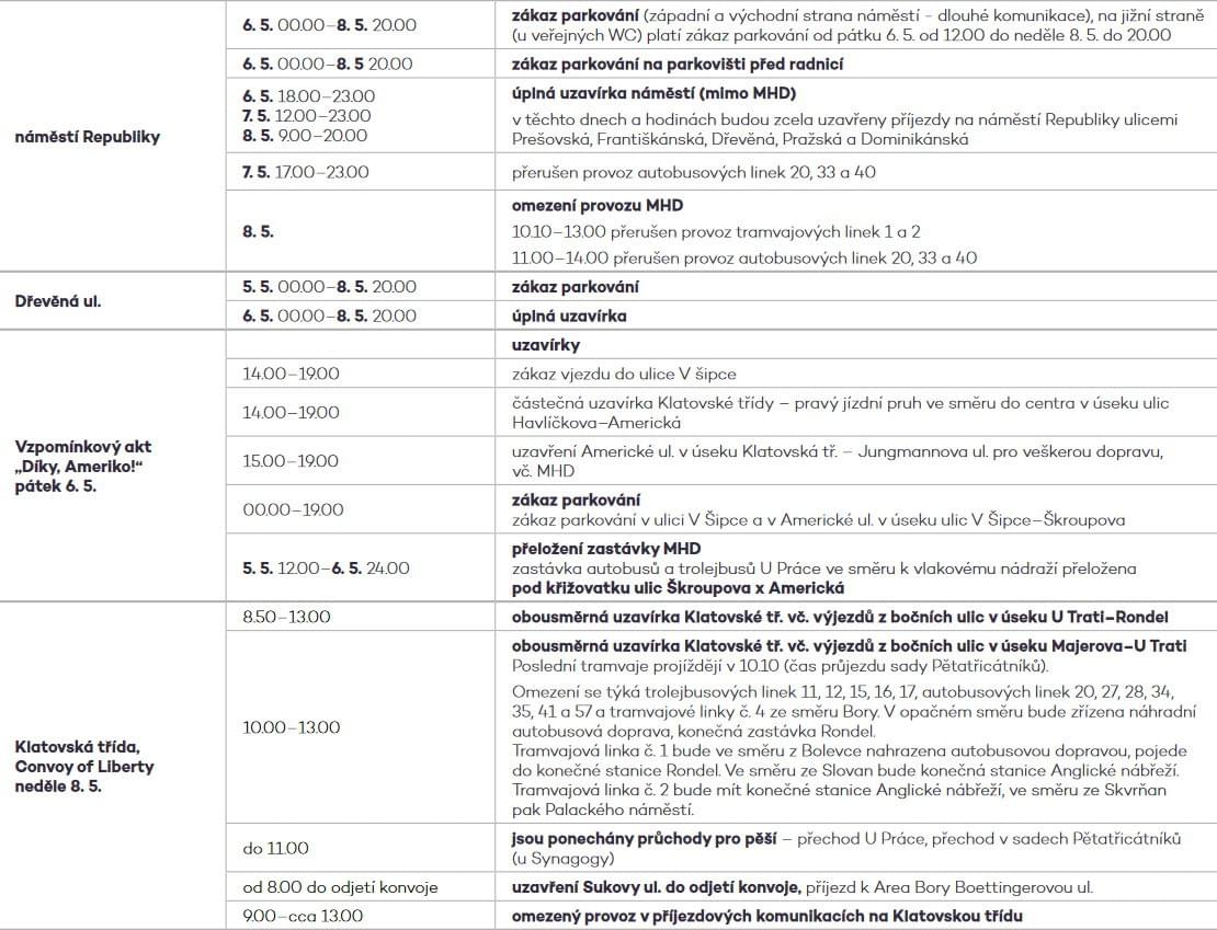Na náměstí Republiky nebude možné po dobu konání slavností, tedy od 6. do 8. května, parkovat podél západní, východní (dlouhé komunikace) a jižní straně náměstí. Na jižní straně bude zákaz parkování platit až od páteční 12. hodiny. Úplně budou uzavřeny vjezdy na náměstí v odpoledních a večerních hodinách (6. května od 18 do 23 hodin, 7. května od 12 do 23 hodin a 8. května kvůli průjezdu konvoje od 9 do 20 hodin).