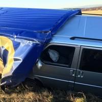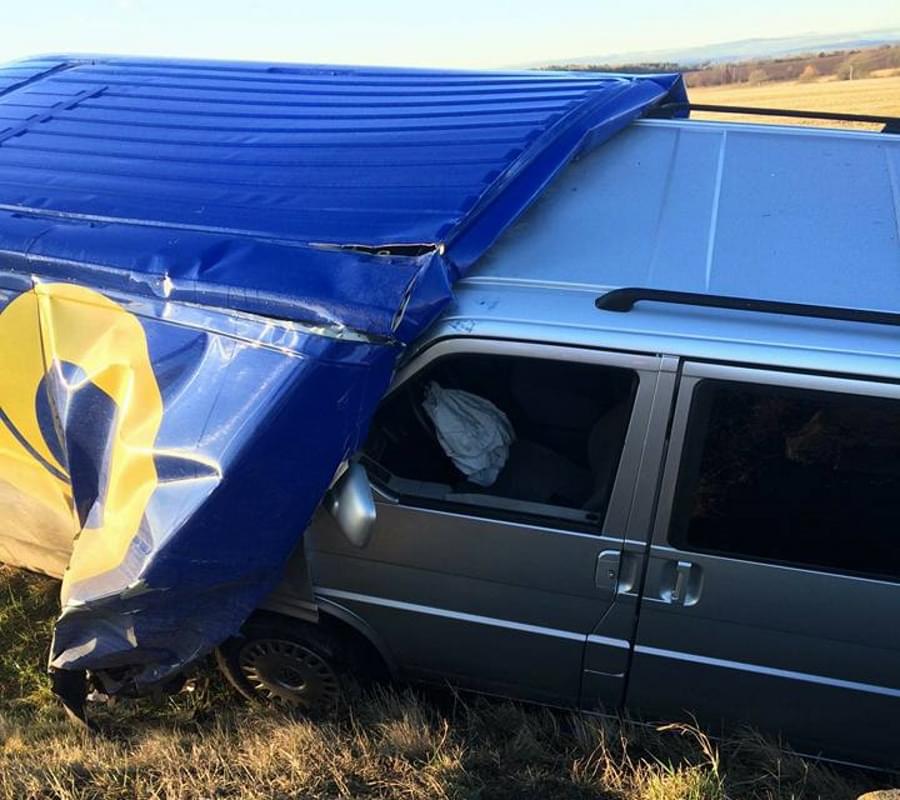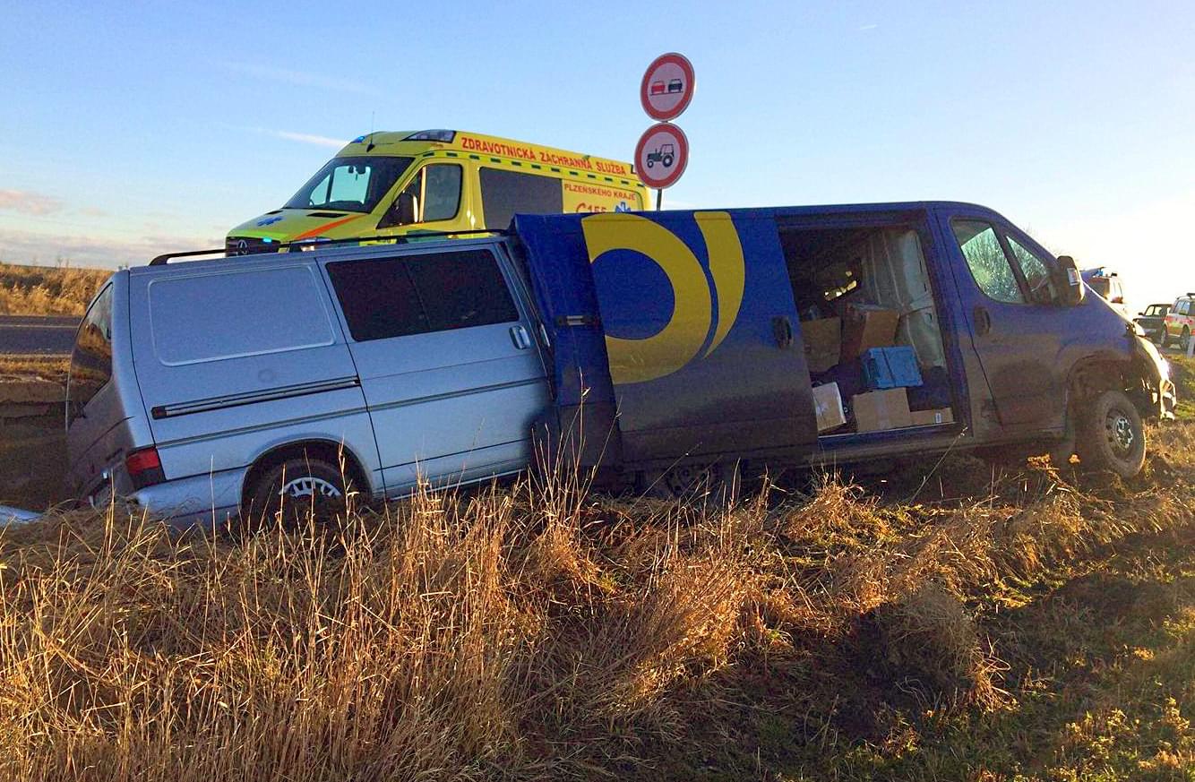 Dnes kolem půl deváté došlo na hlavním tahu z Plzně na Karlovy Vary u odbočky na Všeruby k dopravní nehodě, při které dodávka Volkswagen zezadu narazila do před ní jedoucí dodávky České pošty. Náraz byl tak silný, že se zadní dodávka doslova nacpala do nákladového prostoru předního vozu a oba vozy skončily v příkopě