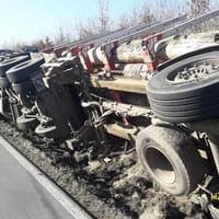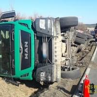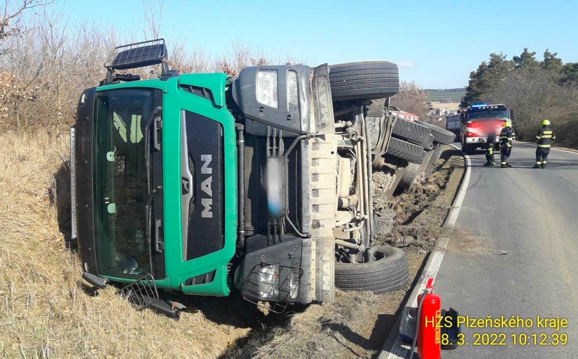 "Řidič narozený v roce 1997 vjel na pravou krajnici, která se s ním utrhla a souprava se převrátila na pravý bok," popsala tisková mluvčí policie.
