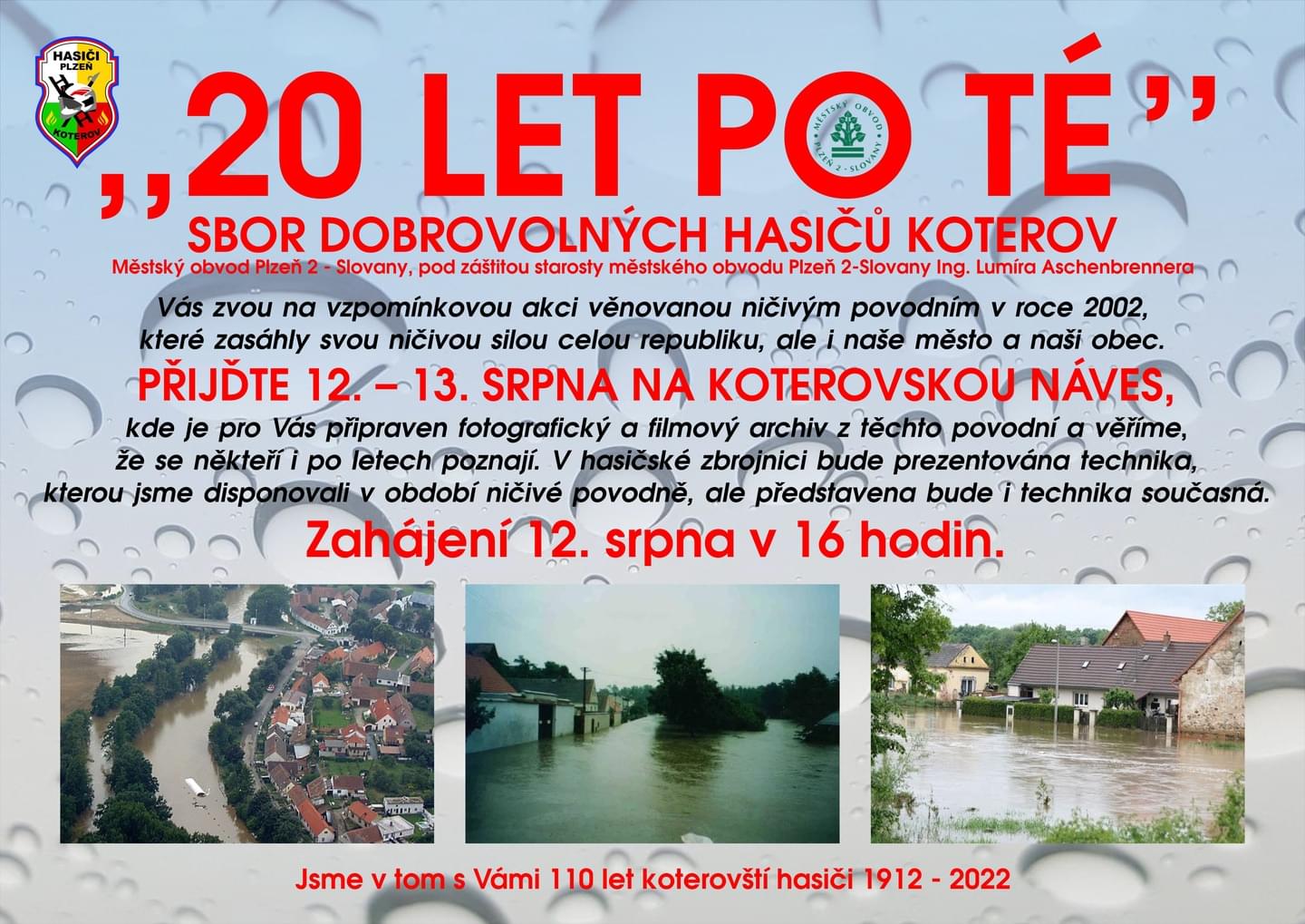 V souvislosti s dvacetiletým výročím ničivých povodní, které zasáhly i Plzeň, pořádá Sbor dobrovolných hasičů Plzeň Koterov vzpomínkovou akci, na kterou by vás rádi pozvali.