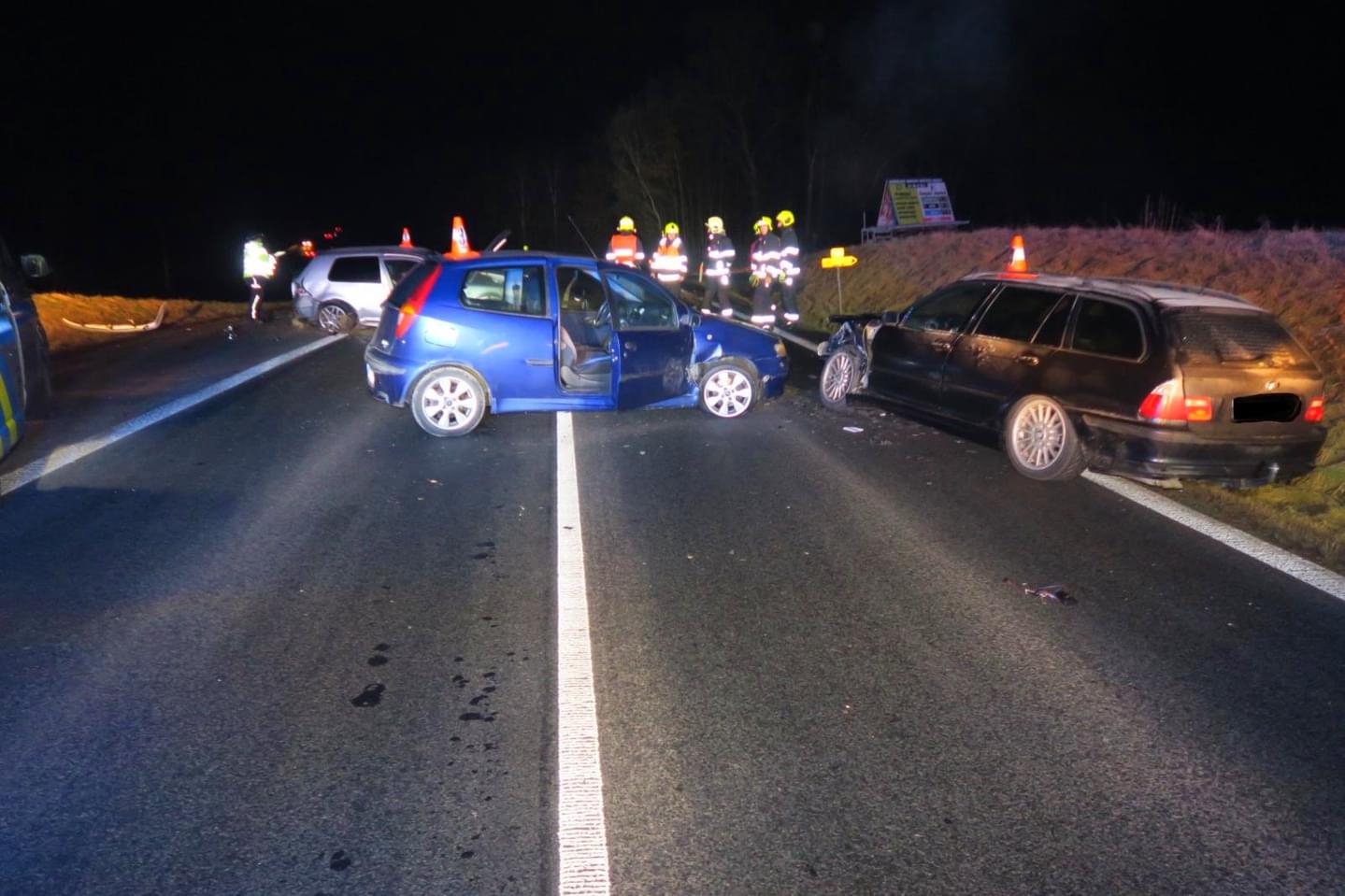 Jen o pět minut později došlo v souvislosti s předchozí havárií k další nehodě, při které byly poškozeny dokonce tři vozy. "Osmapadesátiletý řidič vozidla Fiat Punto jedoucí ve směru ze Kdyně na Domažlice se při jízdě nechoval ohleduplně a ukázněně a při objíždění narazil do havarovaného stojícího vozidla Volkswagen Golf, načež narazil ještě do stojícího vozidla BMW třiadvacetiletého řidiče, který zastavil na pravém okraji pozemní komunikace, když spatřil havarovaný Volkswagen," popsala druhou nehodu mluvčí policie.