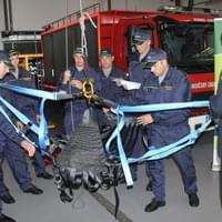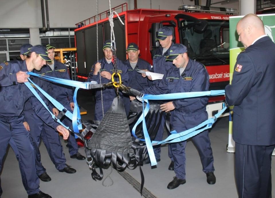 Na předání sítě, určené pro Plzeňsko, dnes čekalo družstvo hasičů, které ji převzalo a začalo hned studovat. Hasiči zkoušeli jak ji použít, zapnout, podvléct či který popruh kam upevnit. Malý problém, tedy že nemají k dispozici koně, vyřešili hasiči elegantně a role koně se ne zcela dobrovolně ujal jeden z hasičů.