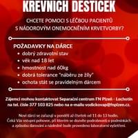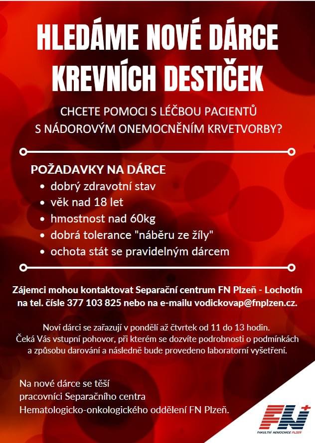 Fakultní nemocnice Plzeň, konkrétně Hematologicko-onkologické oddělení, prosí veřejnost o pomoc. Nutně potřebují nové dárce krevních destiček!