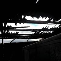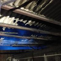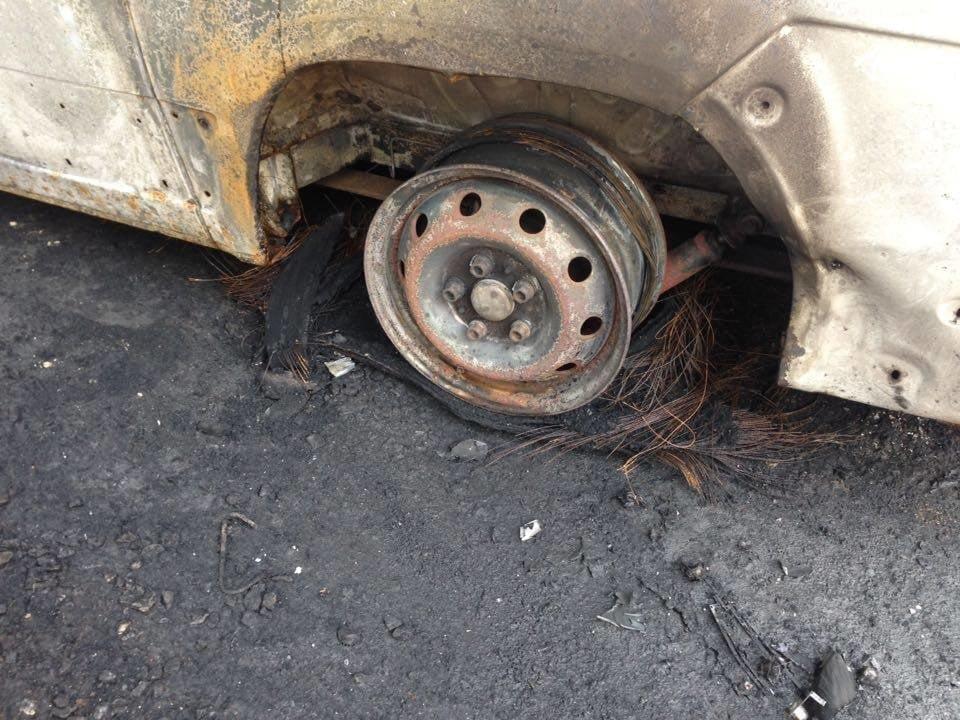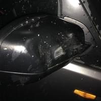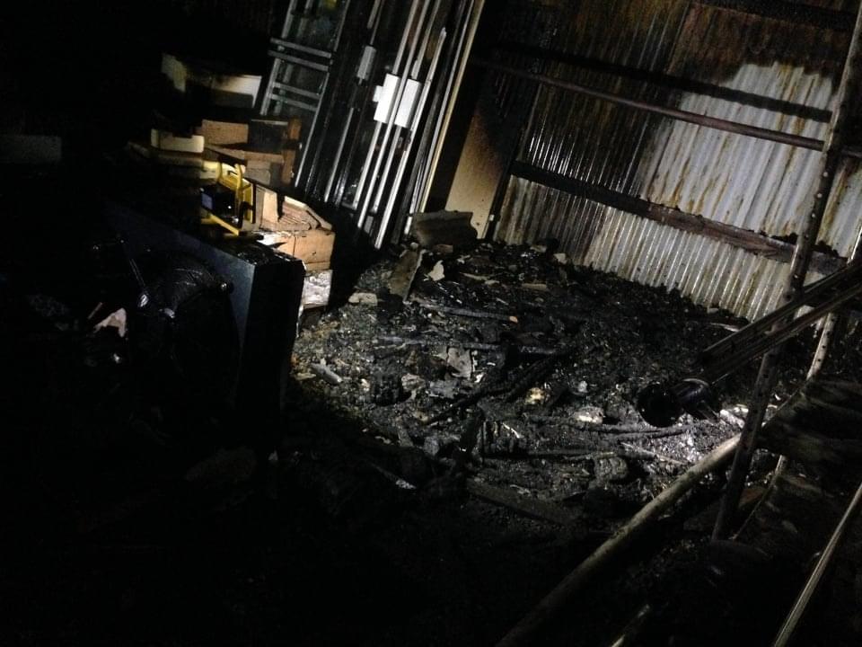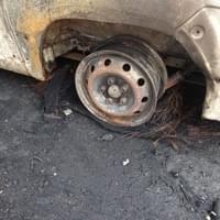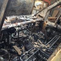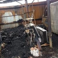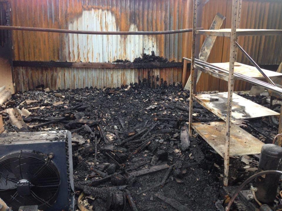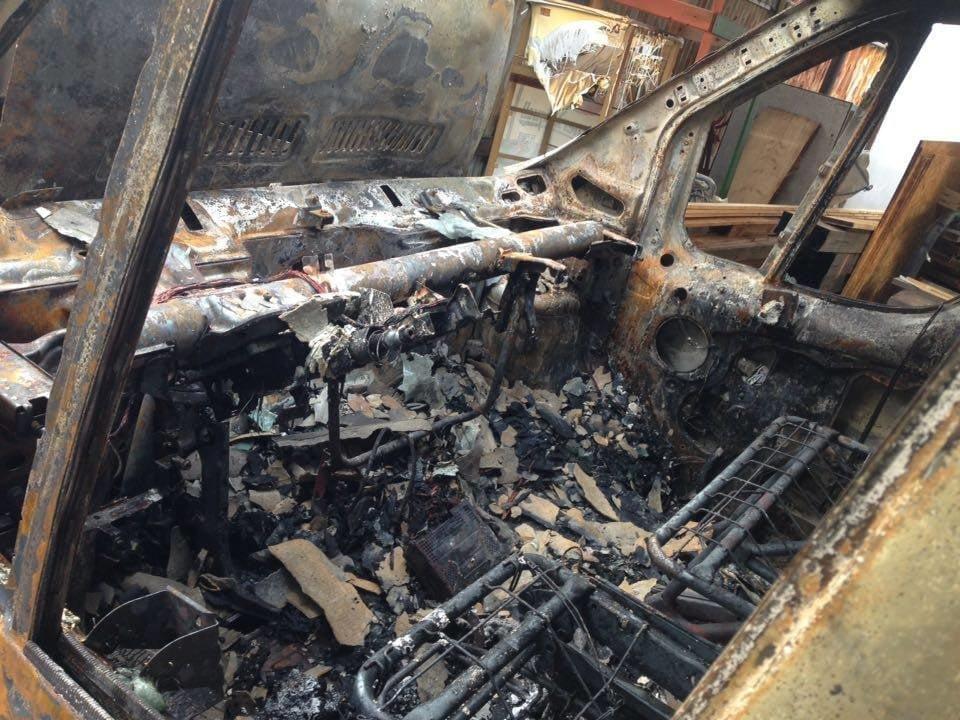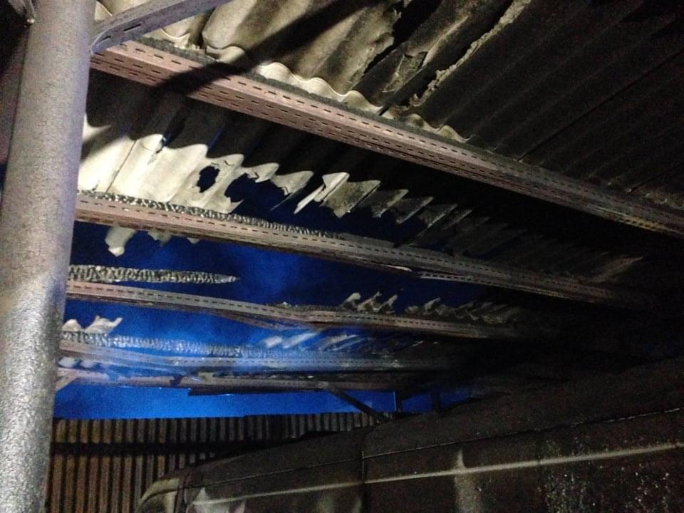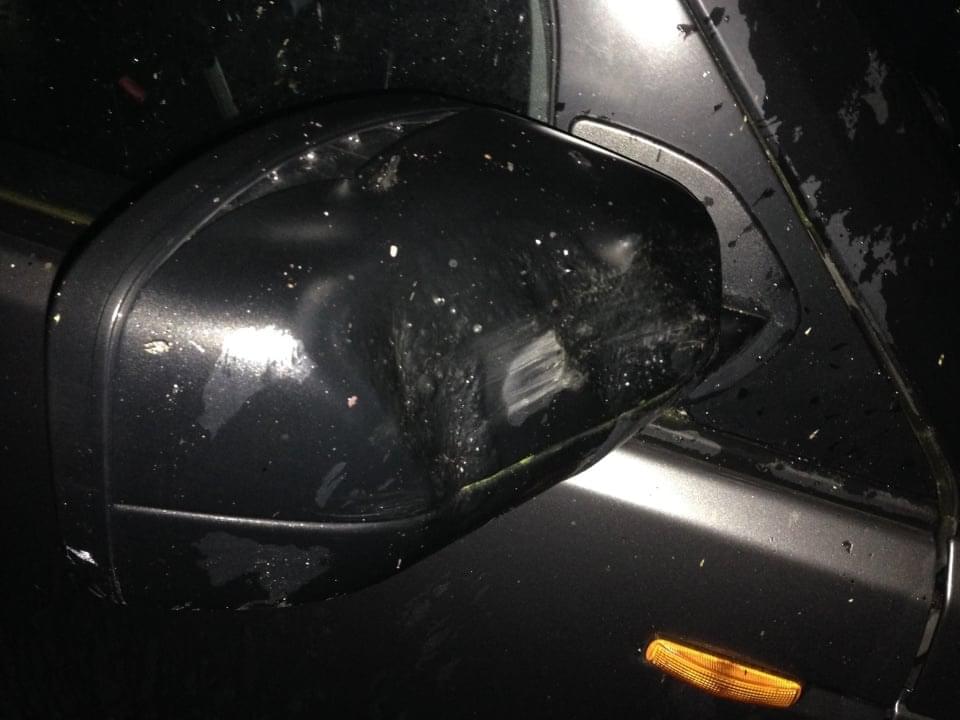 Foto od čtenáře: Žár byl tak velký, že se ohnuly traverzy které nesly střechu nad dodávkou a roztavily se plasty na voze, zaparkovaném na opačné straně areálu (fotka zpětného zrcátka).
