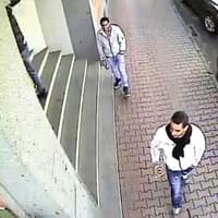 Další dva muži jej doprovázeli ke vchodu objektu a měli na sobě světlé bundy.