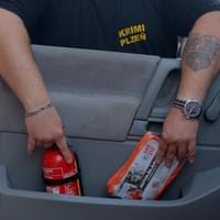 Náš figurant se nejprve pokusí oheň uhasit dekou, což většinou bývá jediná vhodná věc, kterou v autě máme a druhý pak použije námi doporučený hasicí přístroj. Podívejte se sami, jak to dopadne.