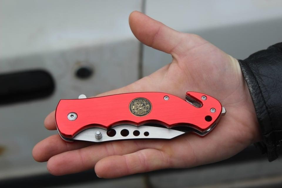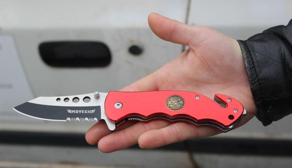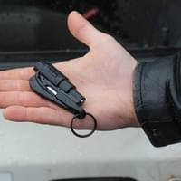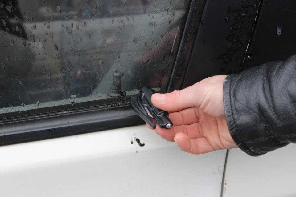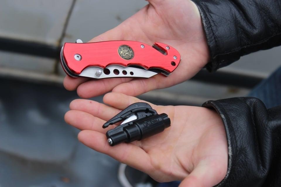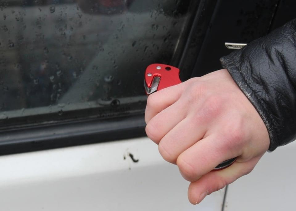 3/ řezač bezpečnostních pásů zaháknout za pás a tahem jej přeříznout