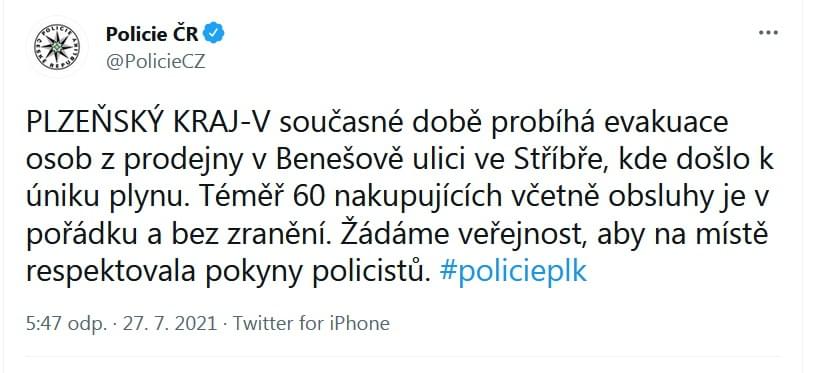 Hasiči a policisté právě v tuto chvíli zasahují v prodejně Lidl v Benešově ulici ve Stříbře, kde podle policie došlo k úniku plynu. Prostor kolem prodejny byl uzavřen a probíhá evakuace. "V současné době probíhá evakuace osob z prodejny, kde došlo k úniku plynu. Téměř šedesát nakupujících včetně obsluhy je v pořádku a bez zranění," uvedla jen před pár okamžiky tisková mluvčí policie.