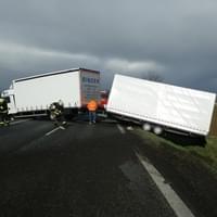 Hasiči z Nýřan vyjeli k dopravní nehodě, která se stala na silnici I/26 za Stodem ve směru na Domažlice. Zřejmě v důsledku silného nárazového větru došlo ke stržení přívěsu nákladníhho vozidla a ten následně strhl i přívěs. Souprava zasahovala přes oba jízdní pruhy. Hasiči asistovali odtahové službě při vyproštění vozidla a následně očistili vozovku. Po dobu zásahu byla komunikace neprůjezdná.