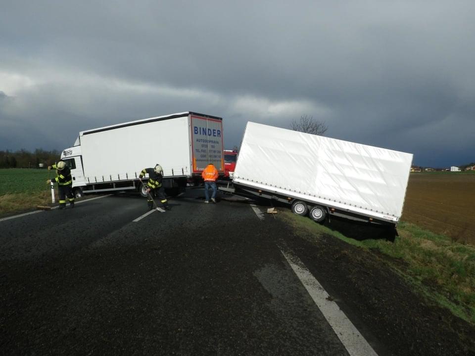 Hasiči z Nýřan vyjeli k dopravní nehodě, která se stala na silnici I/26 za Stodem ve směru na Domažlice. Zřejmě v důsledku silného nárazového větru došlo ke stržení přívěsu nákladníhho vozidla a ten následně strhl i přívěs. Souprava zasahovala přes oba jízdní pruhy. Hasiči asistovali odtahové službě při vyproštění vozidla a následně očistili vozovku. Po dobu zásahu byla komunikace neprůjezdná.