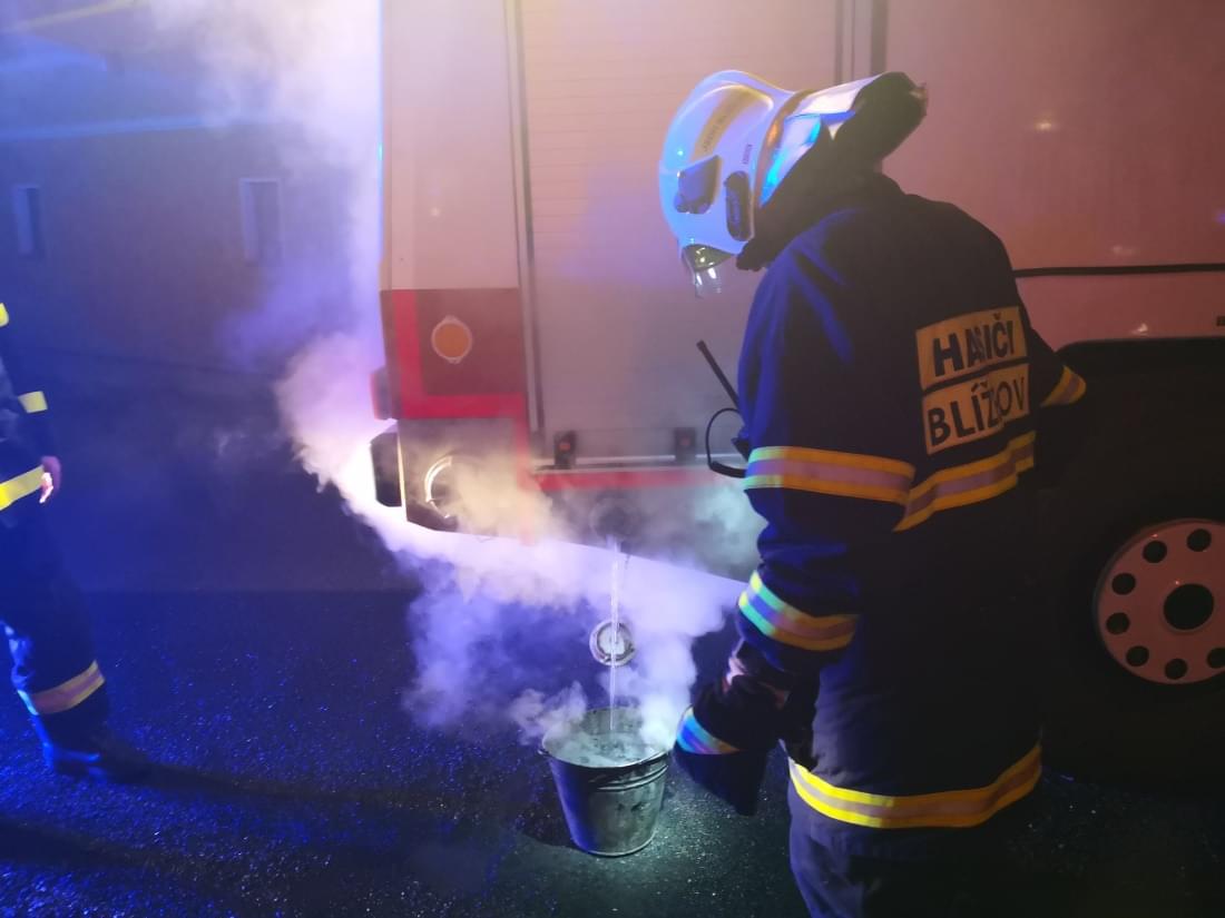 Hasiči vynesli propanbutanovou lahev a pomocí jednoho útočného proudu C provedli její ochlazení. Zraněné ženě, která utrpěla popáleniny na ruce a šok, poskytli první pomoc do příjezdu zdravotnické záchranné služby, která si pak zraněnou i se synem, který byl bez újmy, převzala do péče.