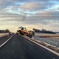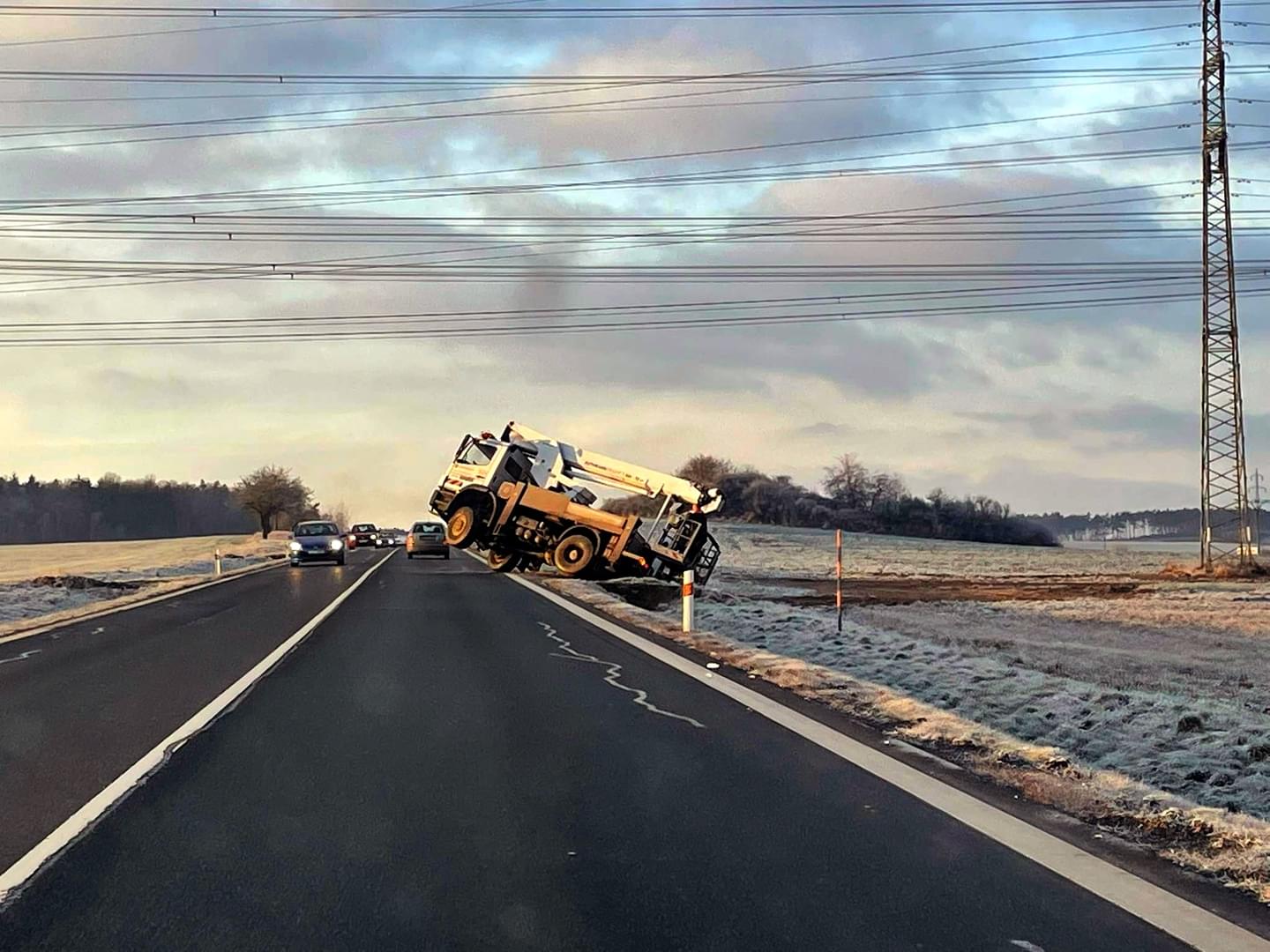 K havárii servisního vozidla s hydraulickou plošinou došlo dnes kolem deváté hodiny dopoledne mezi Stodem a Holýšovem, kde řidič s vozem vyjížděl z polní cesty a při přejíždění mostku zapadl zadním kolem do silničního příkopu.