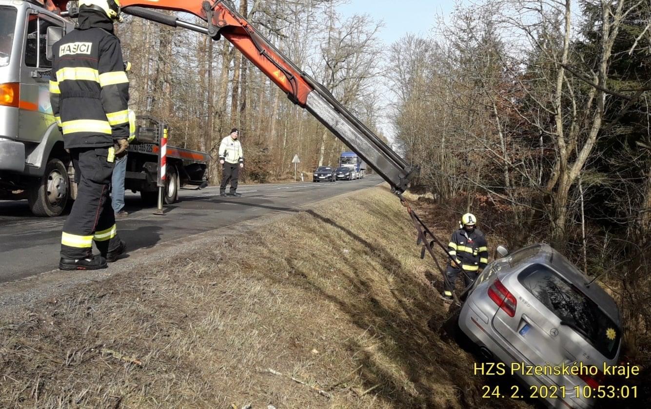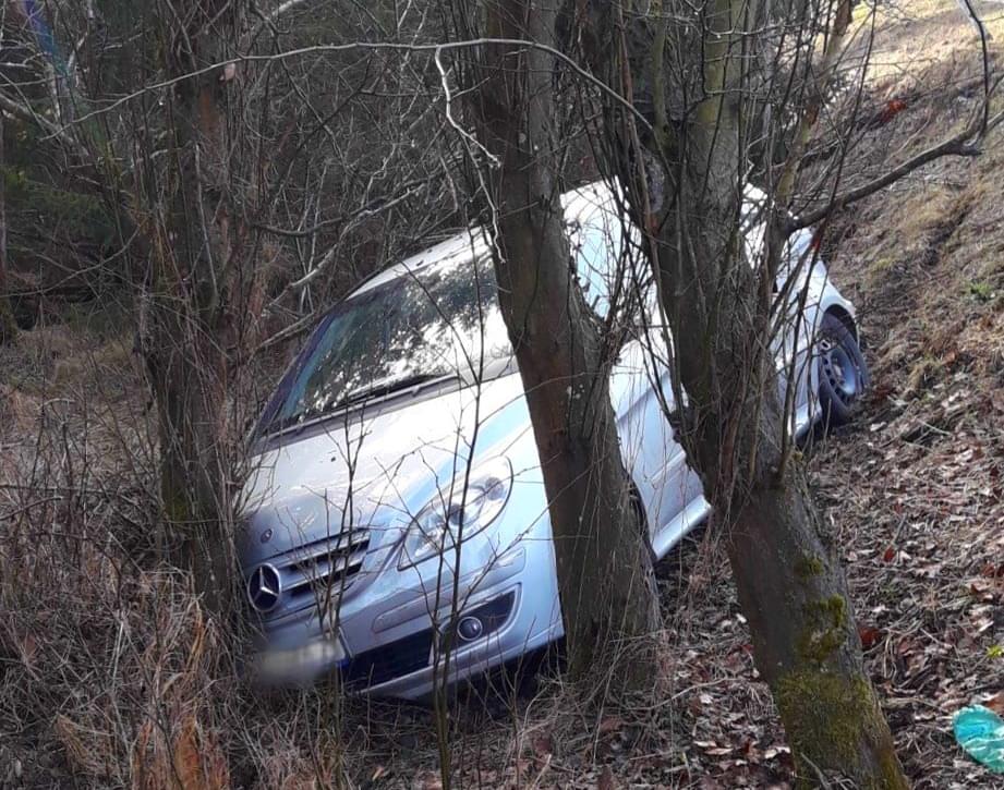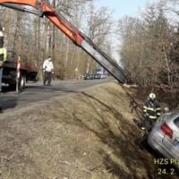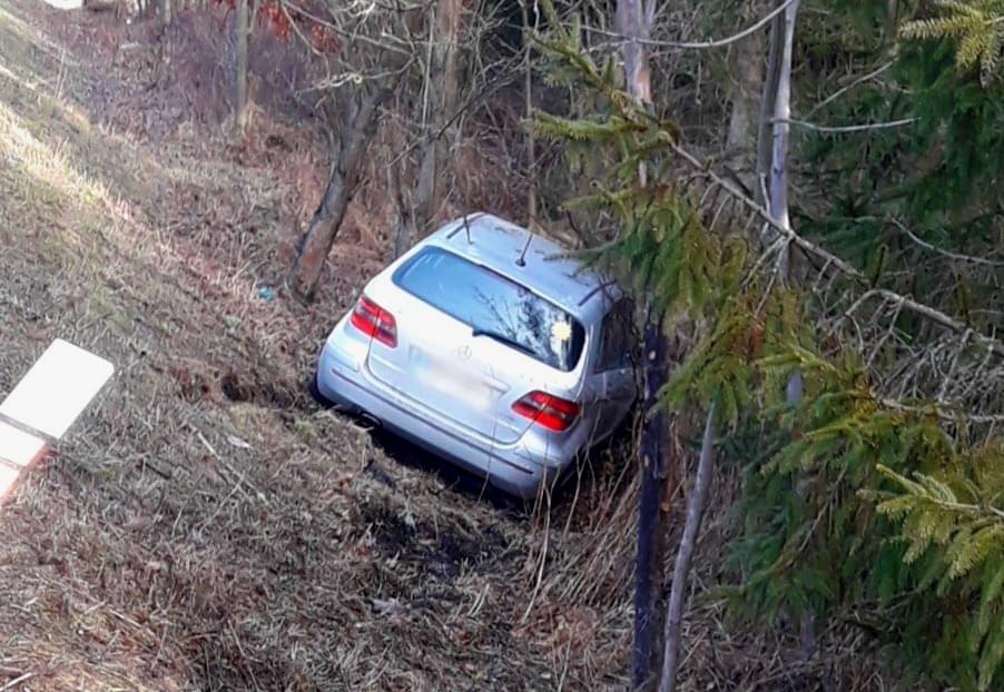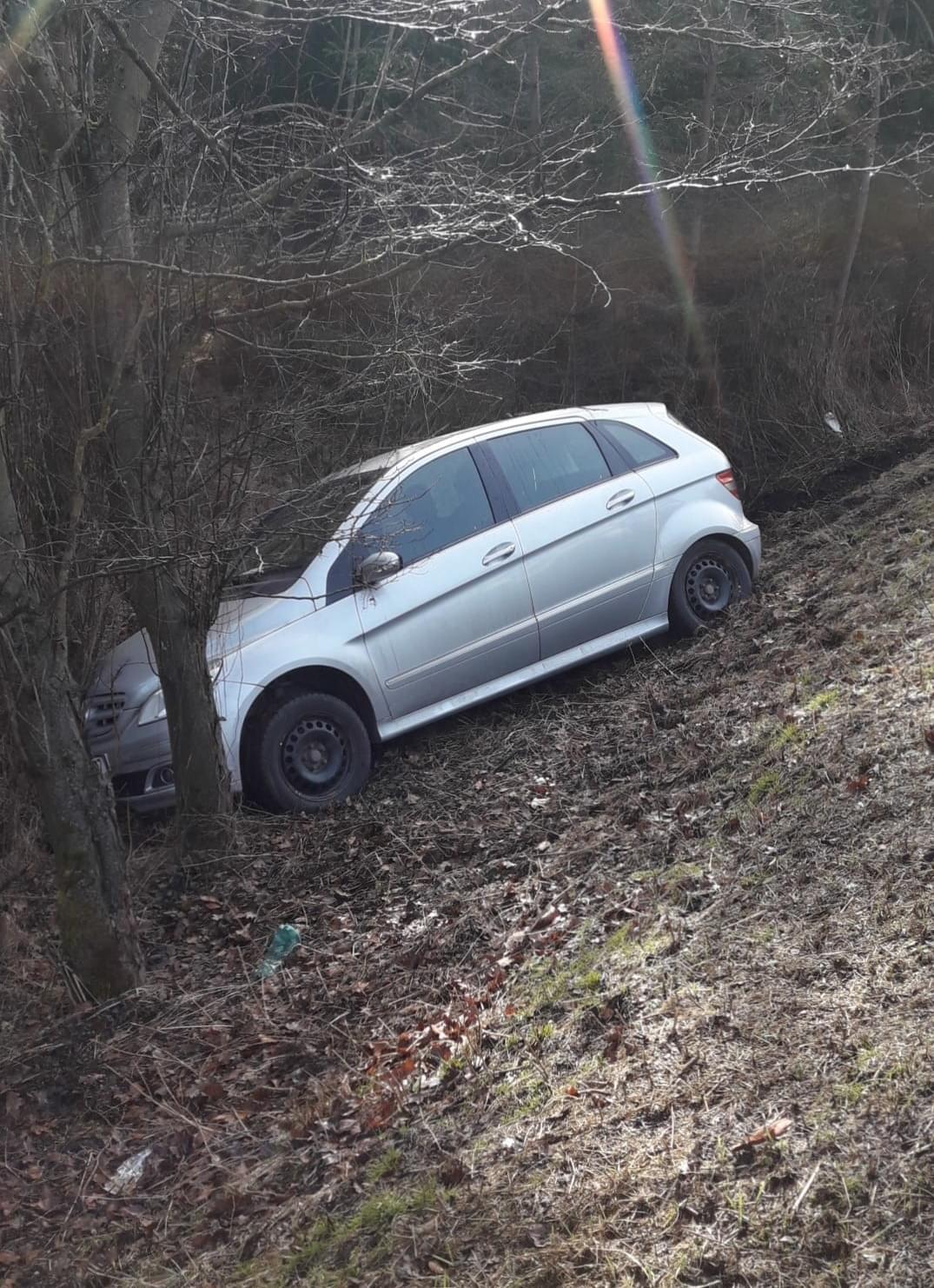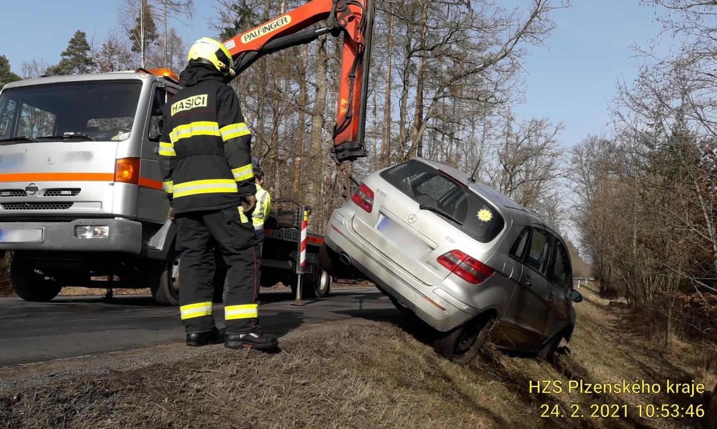 Dnes po deváté hodině dopoledne došlo na silnici mezi Defurovými Lažany a Velkým Borem k havárii osobního vozu Mercedes. Vůz vyjel ze silnice, sjel ze srázu a zastavil se o stromy.