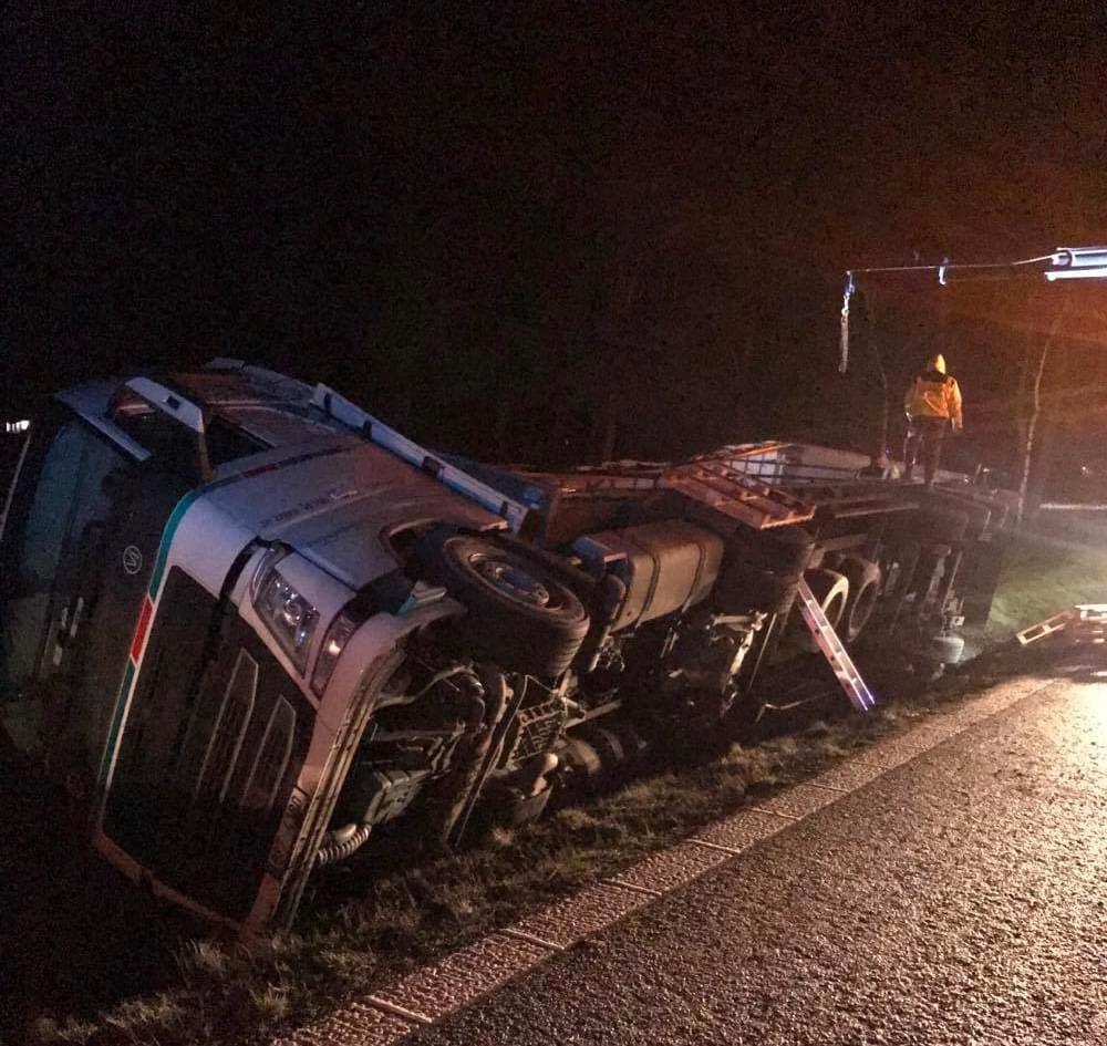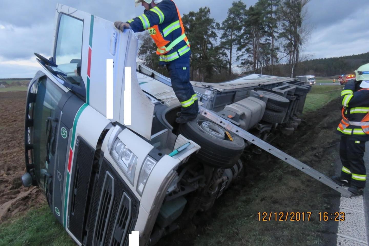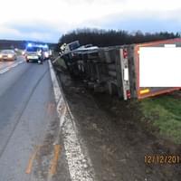 Dnes odpoledne došlo na hlavním tahu z Plzně na Domažlice u Březí k havárii kamionu převážejícího asi 24 tun hnojiva. Vozidlo vyjelo vpravo mimo silnici a následně se převrátilo do příkopu. Při havárii naštěstí nebyl nikdo zraněn.
